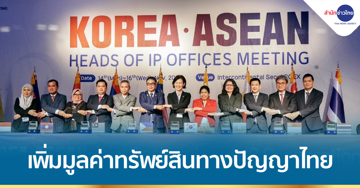 นนทบุรี 16 พ.ย.- อธิบดีกรมทรัพย์สินทางปัญญา นำทีมไทยแลนด์ร่วมอาเซียนจับมือเกาหลีใต้ ยกระดับการส่งเสริมทรัพย์สินทางปัญญาไทย ส่งเสริมให้เกิดการเพิ่มมูลค่าการค้าและการลงทุนด้วยทรัพย์สินทางปัญญาในภูมิภาคอาเซียนและเกาหลีใต้