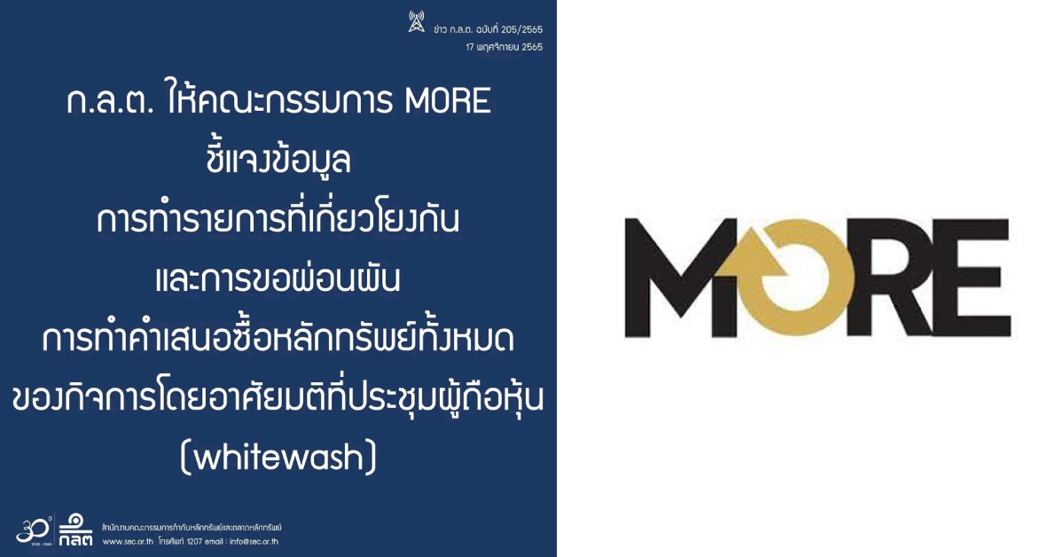 สำนักงานคณะกรรมการกำกับหลักทรัพย์และตลาดหลักทรัพย์ ( ก.ล.ต.) แจ้งให้คณะกรรมการบริษัท มอร์ รีเทิร์น จำกัด (มหาชน) (MORE) ชี้แจงข้อมูลเกี่ยวกับการเสนอขายหุ้นเพิ่มทุนให้แก่ผู้บริหารรายนายอมฤทธิ์ กล่อมจิตเจริญ ซึ่งเข้าข่ายเป็นรายการที่เกี่ยวโยงกัน และการขอผ่อนผันการทำคำเสนอซื้อหลักทรัพย์ทั้งหมดของกิจการโดยอาศัยมติที่ประชุมผู้ถือหุ้น (whitewash) โดยที่ปรึกษาทางการเงินอิสระ (IFA) เห็นว่า ผู้ถือหุ้นไม่ควรลงมติอนุมัติ และมีข้อสังเกตเกี่ยวกับเหตุการณ์ความผิดปกติของราคาหุ้น MORE ซึ่งมีผลกระทบต่อการเสนอขายหุ้นเพิ่มทุนและผู้ถือหุ้นที่จะใช้สิทธิออกเสียงในที่ประชุมผู้ถือหุ้น รวมทั้งความจำเป็นของการเพิ่มทุนในช่วงที่เหตุการณ์ดังกล่าวยังอยู่ระหว่างการตรวจสอบข้อเท็จจริง