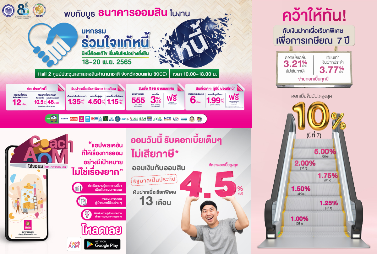 กทม. 17 พ.ย.-ออมสิน ร่วมคลายล็อก หาทางออกให้ลูกหนี้ภาคอีสาน ในงานมหกรรมร่วมใจแก้หนี้ สัญจร ครั้งที่ 2 พบกันที่บูธออมสิน 18-20 พ.ย.65 ณ ศูนย์ประชุมและแสดงสินค้านานาชาติ จ.ขอนแก่น ผ่อนไม่ไหว..พักเงินต้นได้ เติมสภาพคล่องกับสินเชื่อแก้หนี้เพิ่มทุน ผ่อนปรนเกณฑ์อนุมัติ