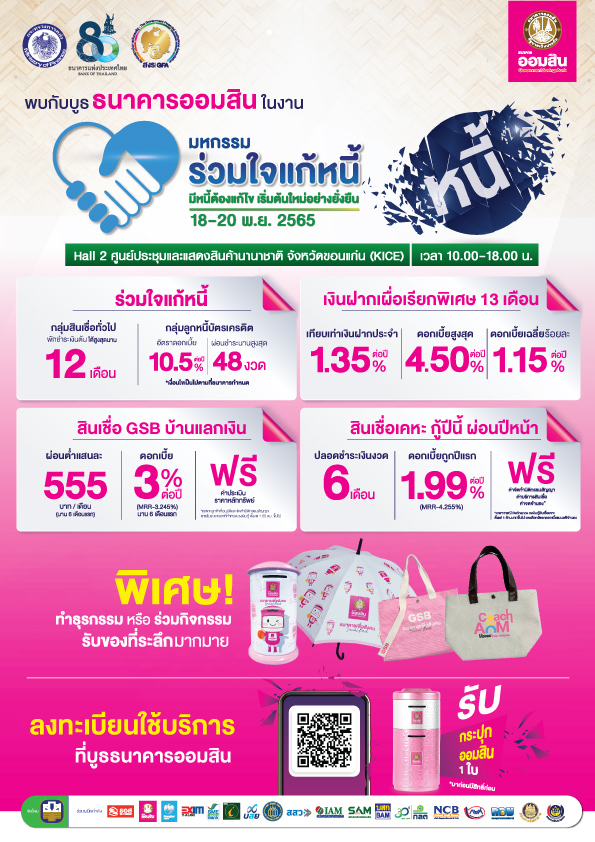 ขอเชิญชวนลูกค้าประชาชนติดต่อพูดคุยเจรจาหนี้ ร่วมกันปลดล็อคให้สถานะหนี้คลายตัวภายใต้สิทธิประโยชน์ที่ธนาคารนำเสนอเป็นพิเศษ รวมทั้งเยี่ยมชม และร่วมกิจกรรมที่บูธธนาคารออมสิน รวมถึงการจัดฝึกอบรมอาชีพ การแสดงและจำหน่ายสินค้าของผู้ประกอบการรายย่อยในโครงการพัฒนาของธนาคารออมสิน ภายในงานมหกรรมร่วมใจแก้หนี้ สัญจร จ.ขอนแก่น ซึ่งจัดขึ้นในวันที่ 18-20 พฤศจิกายน 2565 ณ ฮอลล์ 2 ศูนย์ประชุมและแสดงสินค้านานาชาติ จังหวัดขอนแก่น (KICE) ในเวลา 10.00-18.00 น. ซึ่งมีธนาคารเพื่อการเกษตรและสหกรณ์การเกษตร หรือ ธ.ก.ส. เป็นเจ้าภาพ ทั้งนี้ นอกจากโปรดักส์ไฮไลท์ข้างต้นแล้ว ลูกค้าประชาชนที่ลงทะเบียนใช้บริการที่บูธธนาคารออมสิน จะได้รับกระปุกออมสิน 1 ใบ โดยลงทะเบียนล่วงหน้าก่อนเข้าร่วมงานได้ที่เว็บ https://ln15.gsb.or.th/WEB-DEBT/ .-สำนักข่าวไทย