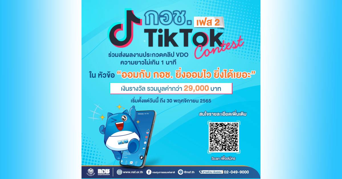 กองทุนการออมแห่งชาติ (กอช.) จัดกิจกรรมสื่อสารประชาสัมพันธ์ กอช. ผ่าน TikTok (กอช. TikTok Contest) เพื่อให้ประชาชนทั่วไปส่งผลงานเข้าร่วมประกวดคลิป VDO ความยาวไม่เกิน 1 นาที ผ่านแพลตฟอร์ม TikTok ในหัวข้อ “ออมกับ กอช. ยิ่งออมไว ยิ่งได้เยอะ” ชิงเงินรางวัลรวมมูลค่ากว่า 29,000 บาท แค่ส่งผลงานเข้าร่วมก็มีสิทธิลุ้นเงินรางวัล 2,000 บาท เริ่มตั้งแต่วันนี้ถึง 30 พฤศจิกายน 2565 ดูรายละเอียดเพิ่มเติมได้ที่ https://www.nsf.or.th/NstTikTokContest2/001