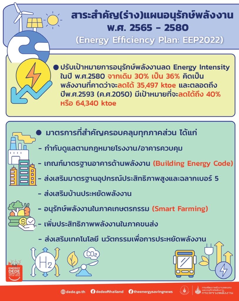 โดยการสัมมนาในวันนี้ได้เปิดกว้างให้ทุกภาคส่วนที่เกี่ยวข้อง อาทิ ภาคอุตสาหกรรม ธุรกิจการค้า บ้านอยู่อาศัยเกษตรกรรม ขนส่ง ตลอดจนผู้ที่สนใจได้มีส่วนร่วมในการให้ข้อมูลและแสดงความคิดเห็นต่อร่างแผน EEP2022 ซึ่งเป็นหนึ่งในแผนด้านพลังงานที่สำคัญภายใต้แผนพลังงานชาติ (National Energy Plan 2022)ในร่างแผน EEP2022 ได้มีการปรับปรุงเพิ่มเติมจากแผน EEP2018 โดยปรับเป้าหมายการอนุรักษ์พลังงาน Energy Intensity ในปีพ.ศ.2580 จากเดิม 30% เป็น 36% หรือคิดเป็นพลังงานที่คาดว่าจะลดได้ 35,497 ktoe และตลอดถึงปีพ.ศ.2593 (ค.ศ.2050) มีเป้าหมายที่จะลดได้ถึง 40% หรือ 64,340 ktoe (พันตันเทียบเท่าน้ำมันดิบ)โดยได้กำหนดมาตรการที่สำคัญไว้อย่างรอบด้านและครอบคลุมทุกภาคส่วน ได้แก่ การกำกับดูแลตามกฎหมายโรงงาน/อาคารควบคุม เกณฑ์มาตรฐานอาคารด้านพลังงาน (Building Energy Code) การส่งเสริมมาตรฐานอุปกรณ์ประสิทธิภาพสูงและฉลากเบอร์ 5 การส่งเสริมบ้านประหยัดพลังงาน การอนุรักษ์พลังงานในภาคเกษตรกรรม Smart Farming และเพิ่มประสิทธิภาพพลังงานในภาคขนส่ง เป็นต้น .-สำนักข่าวไทย