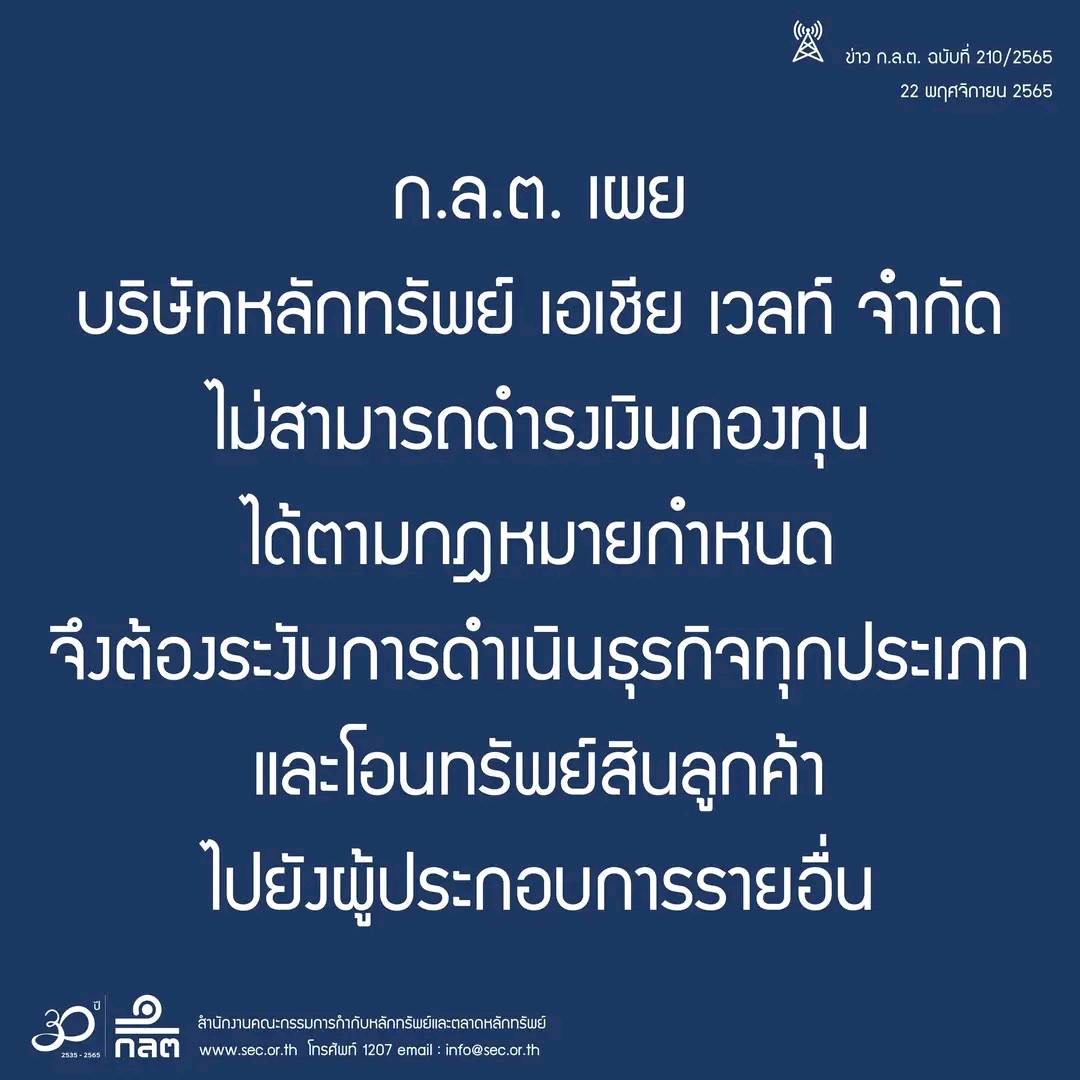 สำนักงานคณะกรรมการกำกับหลักทรัพย์และตลาดหลักทรัพย์ (ก.ล.ต.) แจ้งว่า ด้วยบริษัทหลักทรัพย์ เอเชีย เวลท์จำกัด (บล.เอเชีย เวลท์) ไม่สามารถดำรงเงินกองทุนสภาพคล่องสุทธิ (Net Capital: NC) ได้ตามที่กฎหมายกำหนดโดยมีเงินกองทุนต่ำกว่า 0 ติดต่อกันเกิน 5 วันทำการ นับตั้งแต่วันที่ 14 พฤศจิกายน 2565 ซึ่งตามประกาศ ก.ล.ต. ที่ สธ. 64/2563 เรื่อง การคำนวณและการรายงานการคำนวณเงินกองทุนของผู้ประกอบธุรกิจและข้อกำหนดในกรณีที่ไม่สามารถดำรงเงินกองทุนได้* บล.เอเชีย เวลท์ ต้องดำเนินการตามที่กำหนดในประกาศดังกล่าว ซึ่งรวมถึงกรณีดังต่อไปนี้