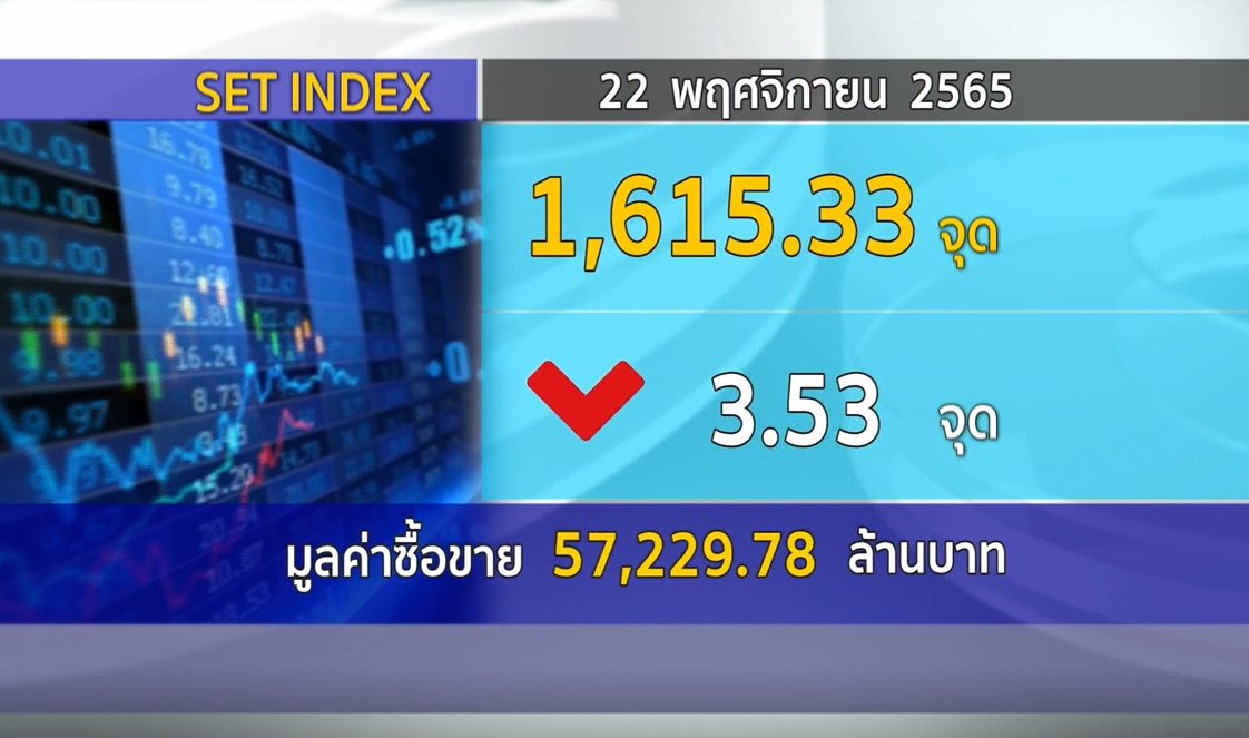 กทม. 22 พ.ย.-ตลาดหลักทรัพย์ ปิดวันนี้ที่ 1,615.33 จุด ลดลง 3.53 จุด (-0.22%) มูลค่าการซื้อขาย 57,229.78 ล้านบาท