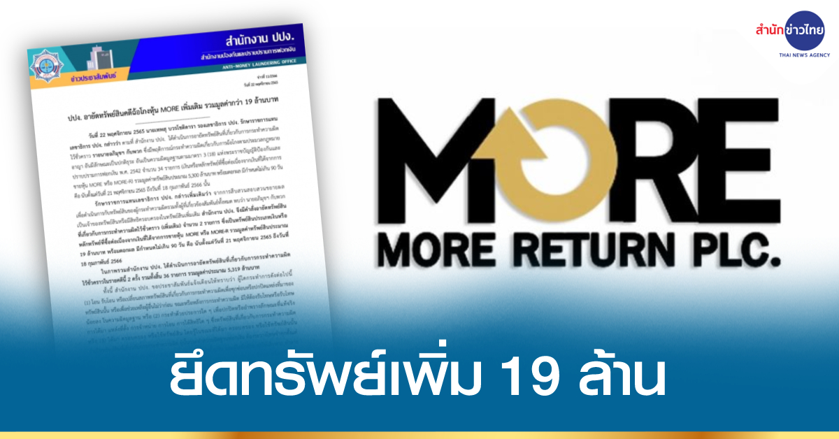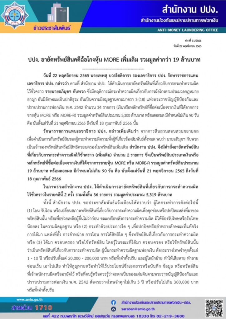 ปัญหาความผิดปกติการซื้อขายหุ้นบริษัท มอร์ รีเทิร์น จำกัด (มหาชน) หรือหุ้น MORE วันนี้ (22 พ.ย.65) นายเทพสุ บวรโชติดารา รองเลขาธิการสำนักงานคณะกรรมการป้องกันและปราบปรามการฟอกเงิน (ปปง.) เปิดเผยว่า ปปง.ได้อายัดทรัพย์สินที่เกี่ยวกับการกระทำความผิดไว้ชั่วคราว รายนายอภิมุข กับพวก ซึ่งมีพฤติการณ์กระทำความผิดเกี่ยวกับการฉ้อโกงตามประมวลกฎหมายอาญา อันมีลักษณะเป็นปกติธุระ อันเป็นความผิดมูลฐานตามกฎหมายฟอกเงิน จำนวน 34 รายการ ซึ่งเป็นเงินหรือหลักทรัพย์ที่ซื้อต่อเนื่องจากเงินที่ได้จากการขายหุ้น MORE หรือ MORE-R รวมมูลค่าทรัพย์สินประมาณ 5,300 ล้านบาท พร้อมดอกผล มีกำหนดไม่เกิน 90 วัน คือ นับตั้งแต่วันที่ 21 พ.ย.65 ถึงวันที่ 18 ก.พ.66