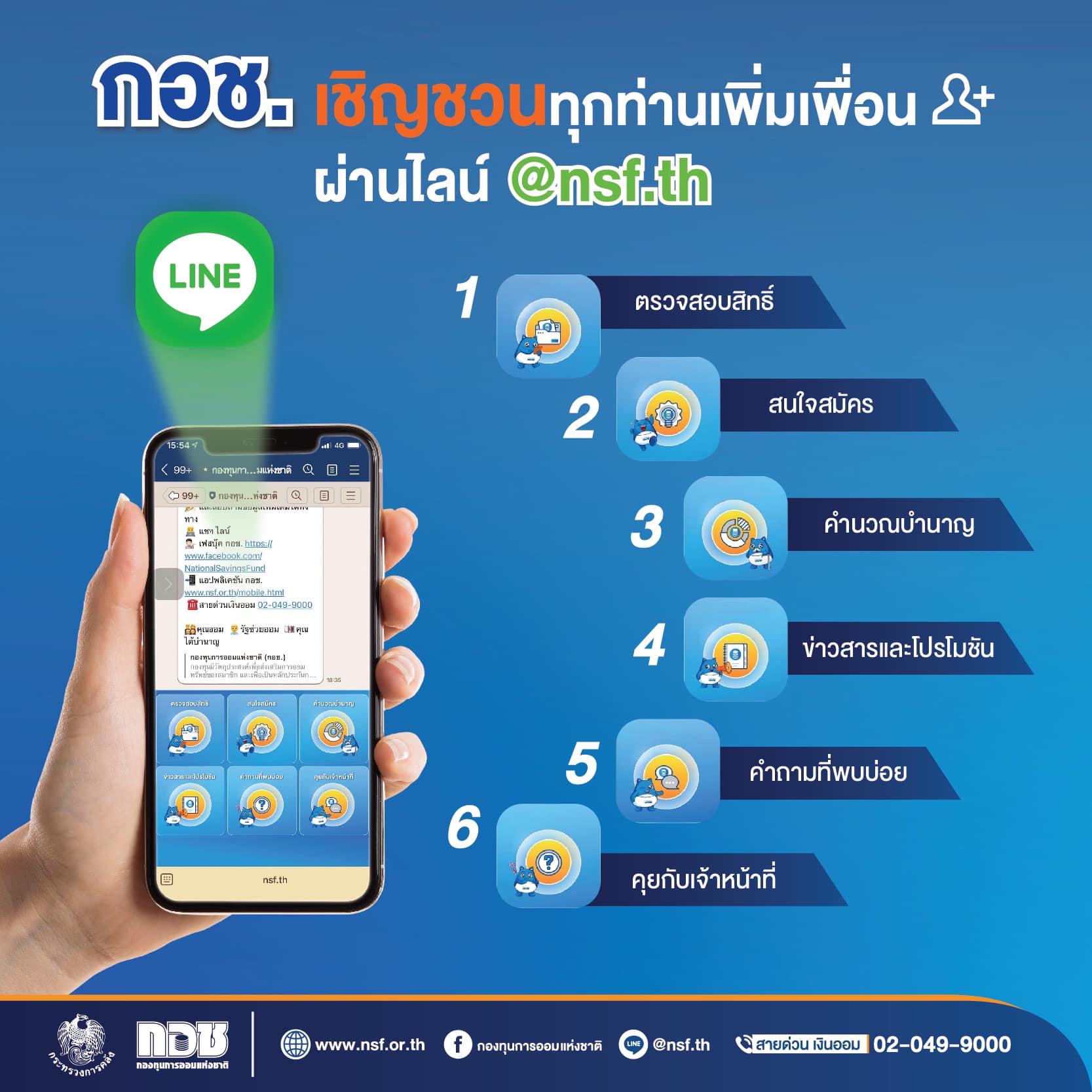 กองทุนการออมแห่งชาติ หรือ กอช. เชิญชวนสมาชิกและประชาชนทั่วไป เป็นเพื่อนไลน์กับ กอช. เพียงเสิร์ชคำว่า “@nsf.th” ใช้บริการตรวจสอบสิทธิ์ สมัครสมาชิก คำนวณบำนาญ ข่าวสารและโปรโมชัน และบริการอื่นๆ ของ กอช.