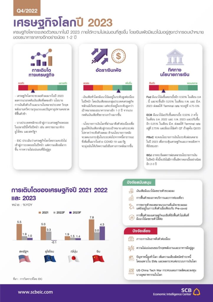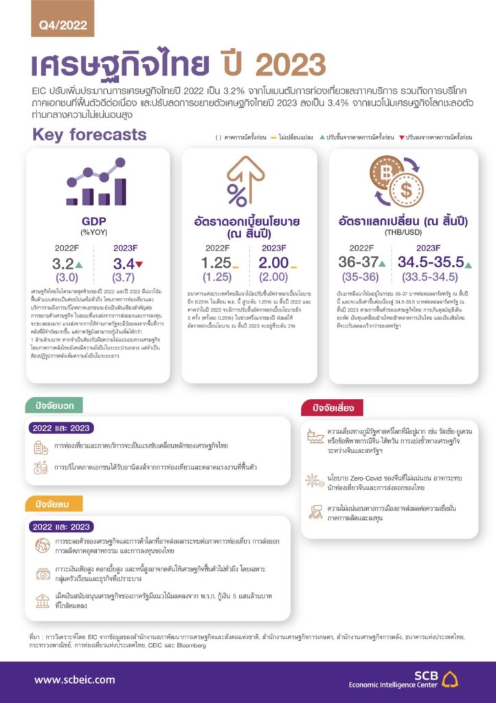 ดร.สมประวิณ มันประเสริฐ รองผู้จัดการใหญ่ ธนาคารไทยพาณิชย์ กล่าวว่า ฝ่ายวิจัยด้านเศรษฐกิจ และตลาดการเงิน Economic Intelligence Center (EIC) ปรับประมาณการเศรษฐกิจไทยปี 2565 เป็นร้อยละ 3.2 จากเดิมร้อยละ3.0 จากแรงส่งการท่องเที่ยวที่ฟื้นตัวต่อเนื่อง รวมถึงการบริโภคภาคเอกชนที่ได้รับอานิสงส์จากภาคการท่องเที่ยวและบริการที่เกี่ยวข้อง รวมถึงรายได้แรงงานปรับเพิ่มขึ้น สำหรับแนวโน้มปี 2566 EIC ปรับลดคาดการณ์การเติบโตของเศรษฐกิจไทยร้อยละ 3.4 จากเดิมร้อยละ 3.7 ตามแนวโน้มเศรษฐกิจโลก ชะลอลงมาก เพราะมีความไม่แน่นอนสูงขึ้น บางประเทศหลักอาจเผชิญภาวะเศรษฐกิจถดถอย ส่งผลให้การส่งออกและการลงทุนของไทยชะลอลงตาม