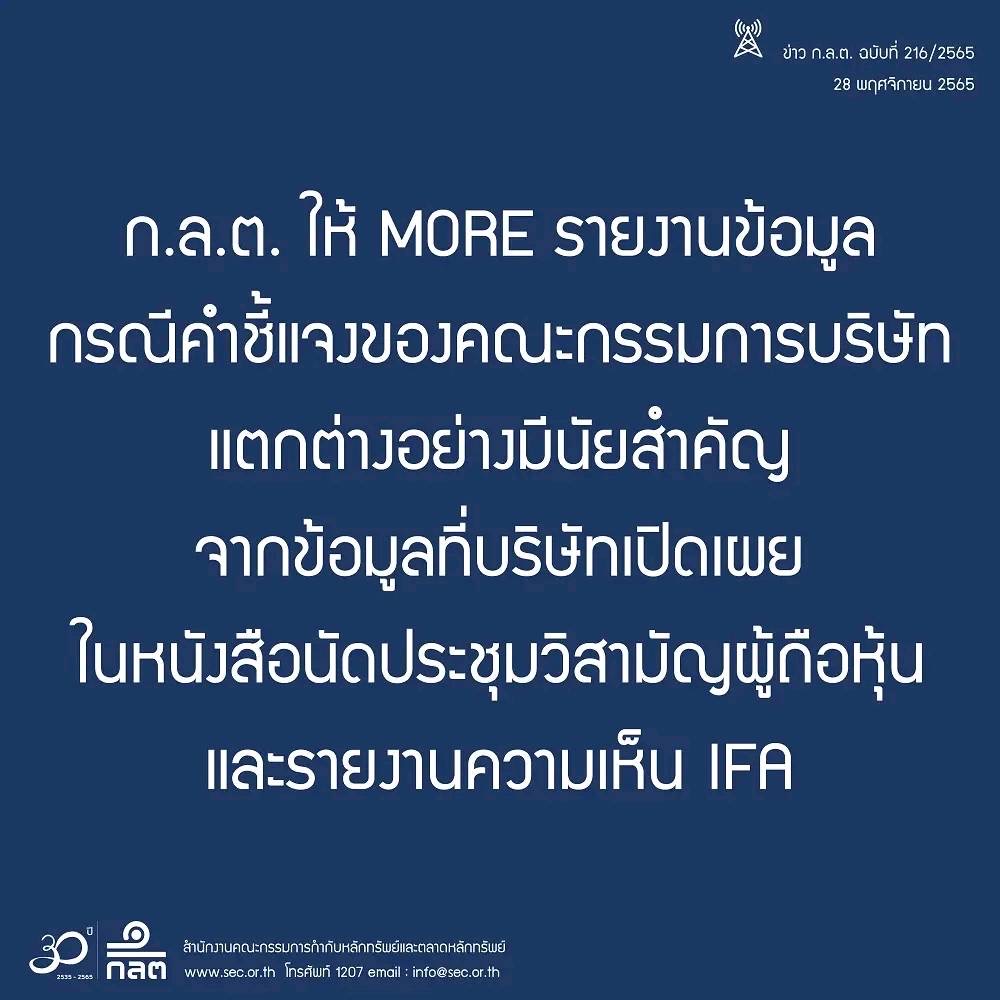 ก.ล.ต. เห็นว่าข้อมูลดังกล่าวถือเป็นข้อมูลที่มีนัยสำคัญต่อการตัดสินใจของผู้ถือหุ้นและอาจกระทบต่อการให้ความเห็นของ IFA ต่อการทำธุรกรรมดังกล่าว ซึ่ง MORE ยังไม่ได้เปิดเผยในหนังสือนัดประชุมให้ถูกต้องครบถ้วน อันอาจทำให้ผู้ถือหุ้นยังไม่ได้รับข้อมูลที่มีนัยสำคัญอย่างเพียงพอต่อการตัดสินใจออกเสียงในวาระที่เกี่ยวข้อง ก.ล.ต. จึงอาศัยอำนาจตามมาตรา 58 (1) แห่งพระราชบัญญัติหลักทรัพย์และตลาดหลักทรัพย์ พ.ศ. 2535 ให้ MORE รายงานข้อมูลและผลกระทบที่เกิดขึ้น พร้อมทั้งนำส่งความเห็นของ IFA ต่อข้อมูลที่เปลี่ยนแปลงดังกล่าวภายใน 3 วันทำการนับแต่วันที่ 25 พฤศจิกายน 2565 พร้อมให้เปิดเผยข้อมูลผ่านระบบสารสนเทศของตลาดหลักทรัพย์แห่งประเทศไทยด้วย