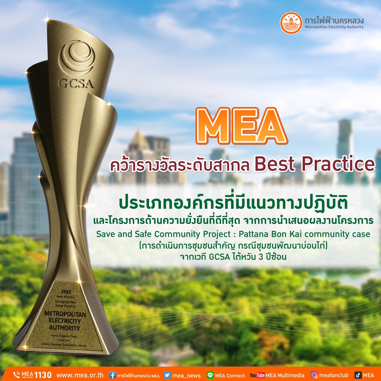 MEA ได้รับรางวัล Best Practice ประเภทองค์กรที่มีแนวทางปฏิบัติ และโครงการด้านความยั่งยืนที่ดีที่สุด จากการนำเสนอผลงานโครงการ Save and Safe Community Project : Pattana Bon Kai community case (การดำเนินการชุมชนสำคัญ กรณีชุมชนพัฒนาบ่อนไก่) จากเวที Global Corporate Sustainability Awards 2022 (GCSA 2022) ไต้หวัน เป็นปีที่ 3 ต่อเนื่อง(2020 2021 2022) จัดโดยสถาบันไต้หวันเพื่อพลังงานที่ยั่งยืน (Taiwan Institute for Sustainable Energy : TAISE) จากการประเมินโดยคณะกรรมการซึ่งประกอบด้วยผู้เชี่ยวชาญจากทั้งภาครัฐ เอกชน และภาคการศึกษาในระดับนานาชาติจากทั่วโลก ที่มีบริษัทและสถาบันต่าง ๆ ส่งผลงานเข้าร่วมกว่า 300 แห่ง