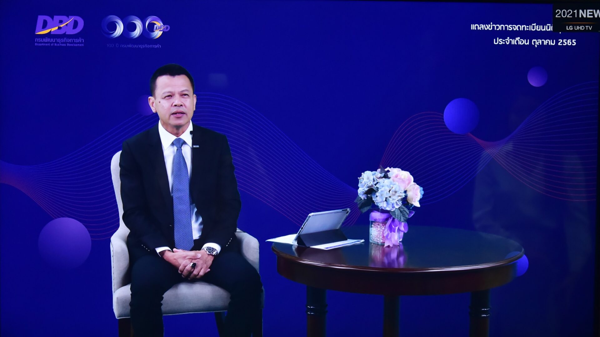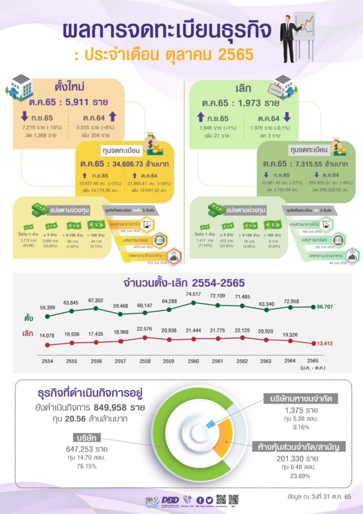 นายจิตรกร ว่องเขตกร รองอธิบดีกรมพัฒนาธุรกิจการค้ากล่าวว่า กรมฯได้วิเคราะห์ยอดการจดทะเบียนธุรกิจประจำเดือนตุลาคม 65 เทียบกับยอดจดทะเบียนจัดตั้งธุรกิจเดือนตุลาคม 2565 มีการจดทะเบียนจัดตั้งธุรกิจใหม่จำนวน5,911 ราย ลดลงจากเดือนที่ผ่านมา (กันยายน 65) คิดเป็น 18% แต่เพิ่มขึ้นเมื่อเทียบกับช่วงเวลาเดียวกันของปีที่ผ่านมา (ตุลาคม 64) คิดเป็น 6% โดยมูลค่าทุนจดทะเบียนจัดตั้งใหม่ จำนวน 34,606 ล้านบาท เพิ่มขึ้นจากเดือนที่ผ่านมา (กันยายน 65) คิดเป็น 75% และเพิ่มขึ้นเมื่อเทียบกับช่วงเวลาเดียวกันของปีก่อน (ตุลาคม 64) คิดเป็น 58%