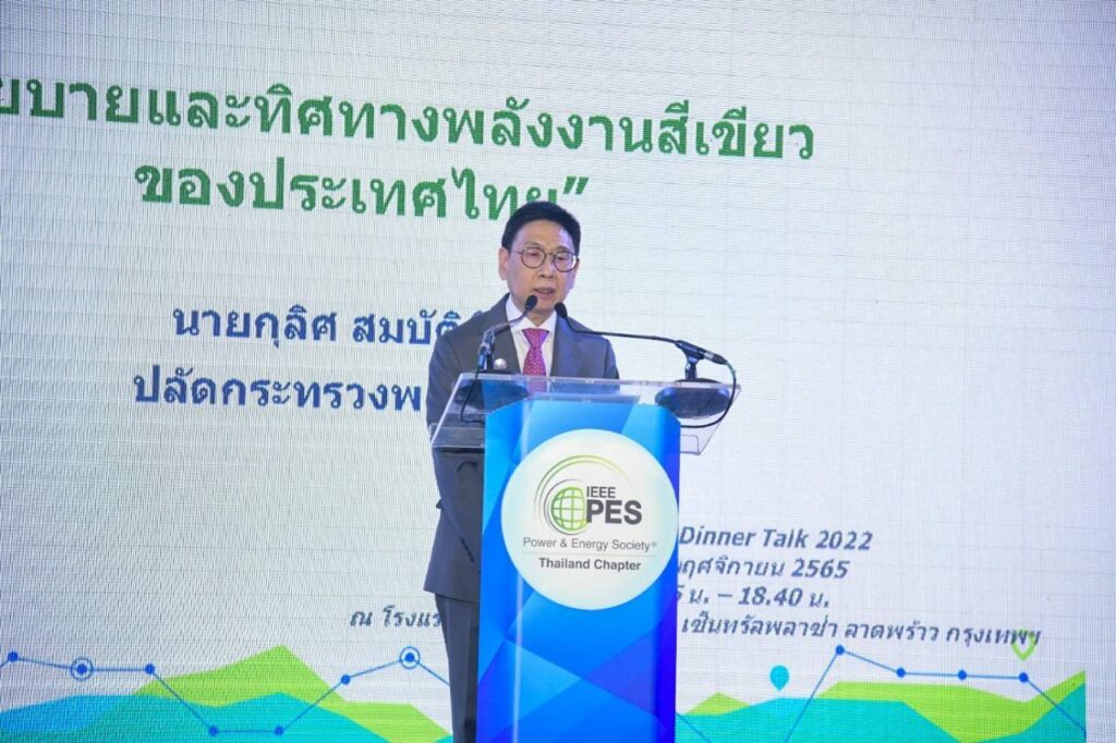 วันที่ 30 พฤศจิกายน 2565 นายกุลิศ สมบัติศิริ ปลัดกระทรวงพลังงาน กล่าวเปิดงาน IEEE PES Dinner Talk 2022 ภายใต้แนวคิด New Chapter of Green Energy : Thailand’s Opportunities and Challenges บทใหม่พลังงานสีเขียวของประเทศไทย โอกาสและความท้าทาย พร้อมแสดงปาฐกถาพิเศษหัวข้อเรื่อง “นโยบายและทิศทางพลังงานสีเขียวของประเทศไทย” จัดโดยสมาคมไฟฟ้าและพลังงานไอทริปเปิลอี (ประเทศไทย) (IEEE Power & Energy Society – Thailand หรือ IEEE PES – Thailand) โดยมี พลตำรวจโท สัญชัย สุนทรบุระ คณะกรรมการการไฟฟ้านครหลวง ร่วมเป็นเกียรติในงาน พร้อมด้วยนายวิลาศ เฉลยสัตย์ ผู้ว่าการ MEA หรือการไฟฟ้านครหลวง ในฐานะ Chairman, IEEE PES – Thailand กล่าวรายงาน ณ ห้องวิภาวดี บอลรูม โรงแรมเซนทาราแกรนด์ แอท เซ็นทรัลพลาซ่า ลาดพร้าว กรุงเทพฯ