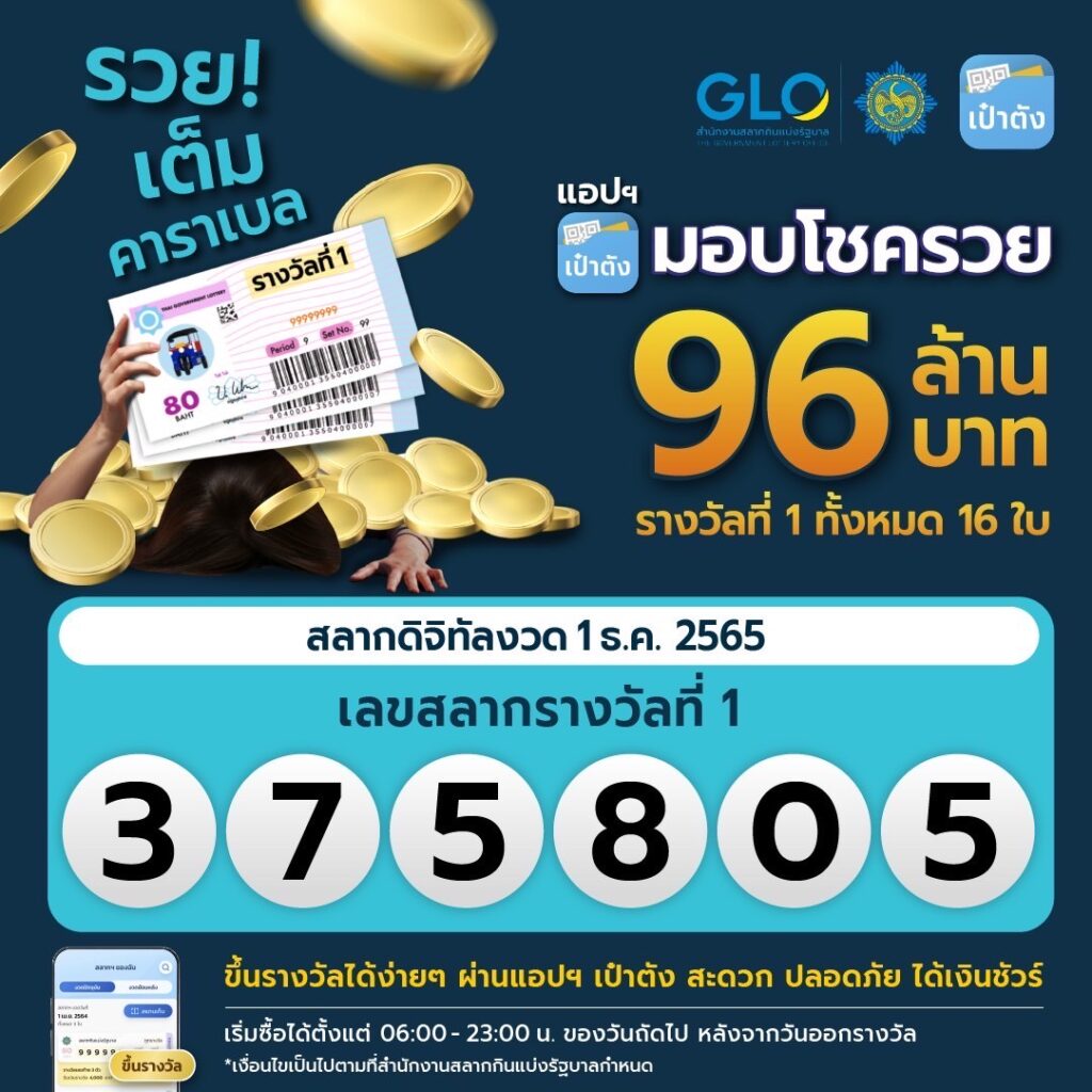 สลากดิจิทัล บนแอปพลิเคชันเป๋าตัง งวดวันที่ 1 ธ.ค. 65 เลขสลากรางวัลที่ 1: 375805 มีผู้ถูกรางวัลที่ 1 ทั้งหมด 16 ใบ รวมเป็นเงิน 96 ล้านบาท โดยสามารถตรวจสอบผลรางวัล และขึ้นรางวัลได้ง่าย ๆ ผ่านแอปฯ เป๋าตัง ข้อมูลการแจ้งเตือน/ วิธีขึ้นเงินรางวัล https://krungthai.com/link/digital-lottery-linetl