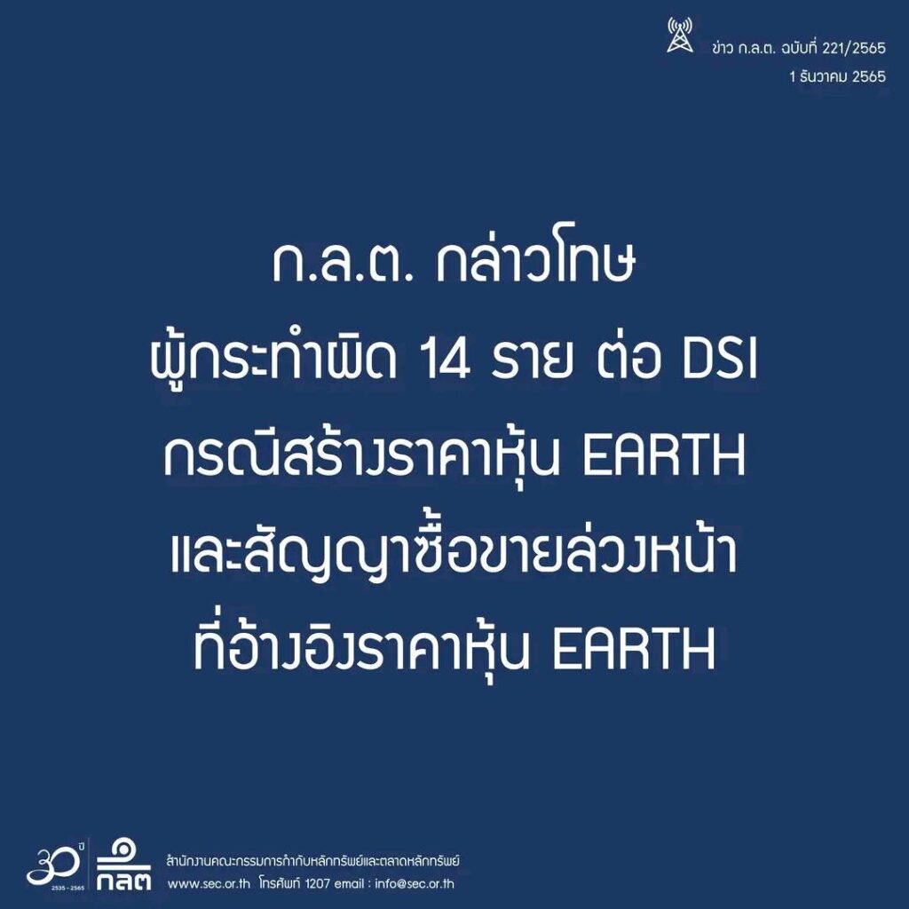 กรุงเทพฯ 1 ธ.ค.- ก.ล.ต. กล่าวโทษผู้กระทำผิด 14 ราย ต่อ DSI สร้างราคาและสัญญาซื้อขายล่วงหน้าที่อ้างอิงราคาหุ้น EARTH