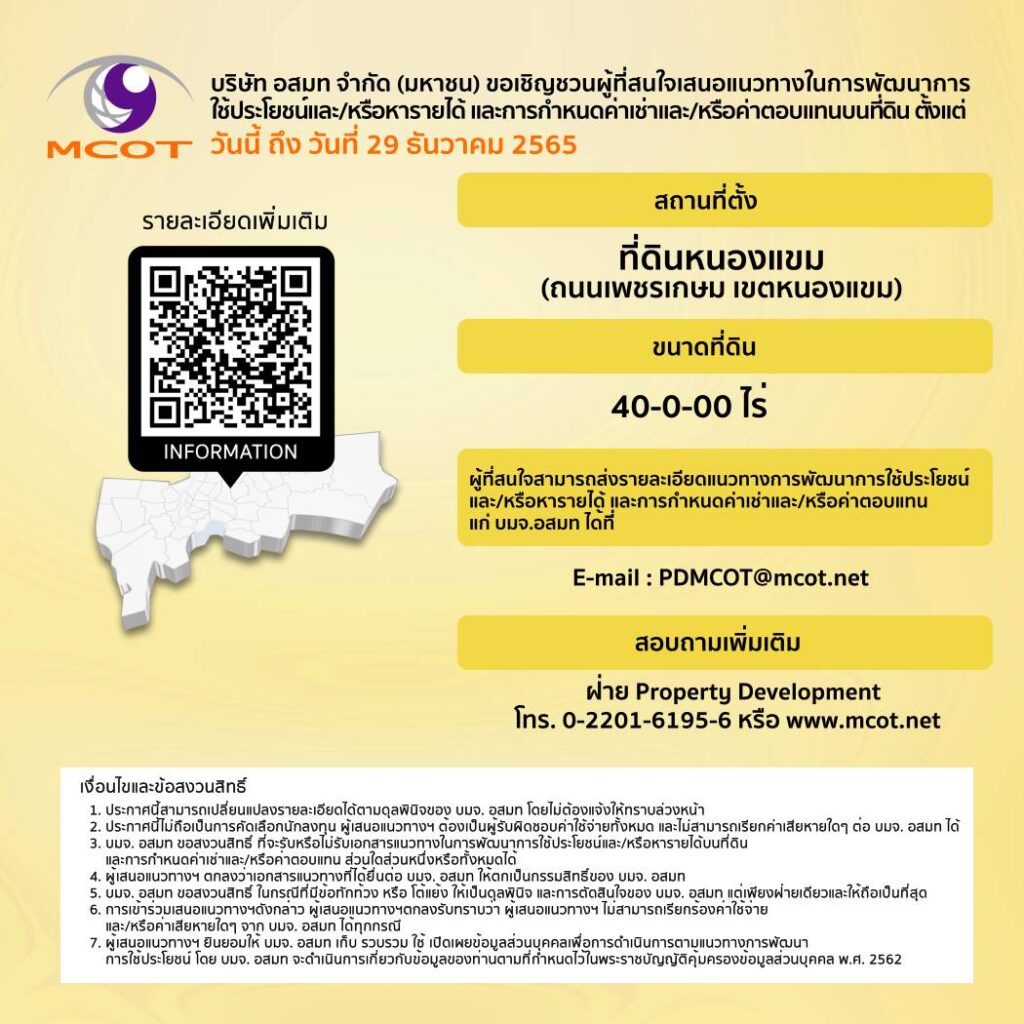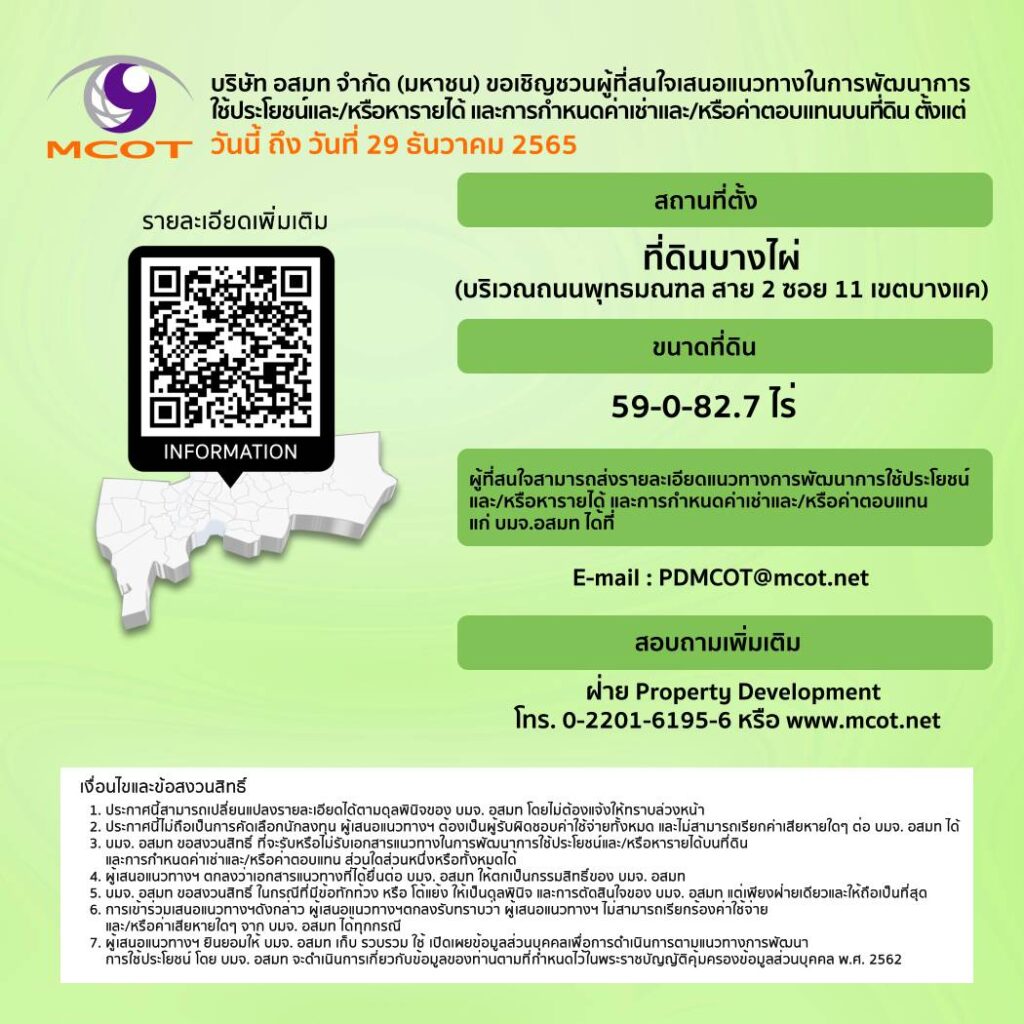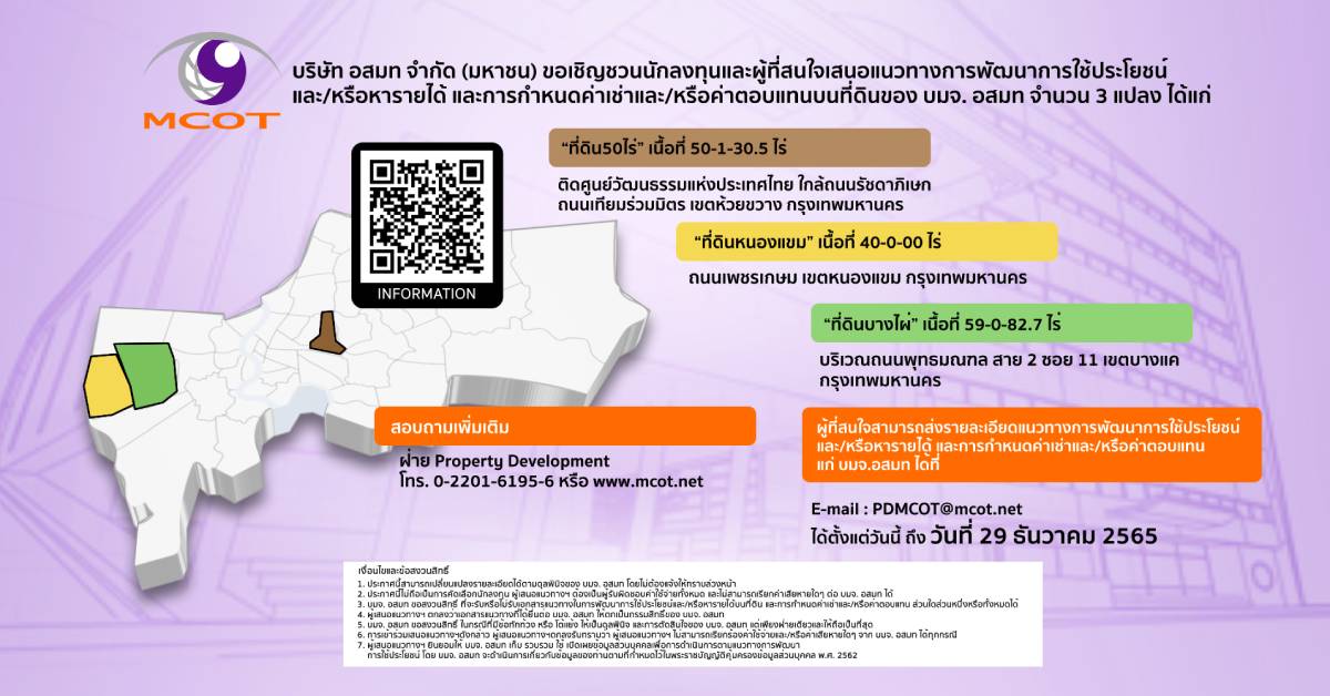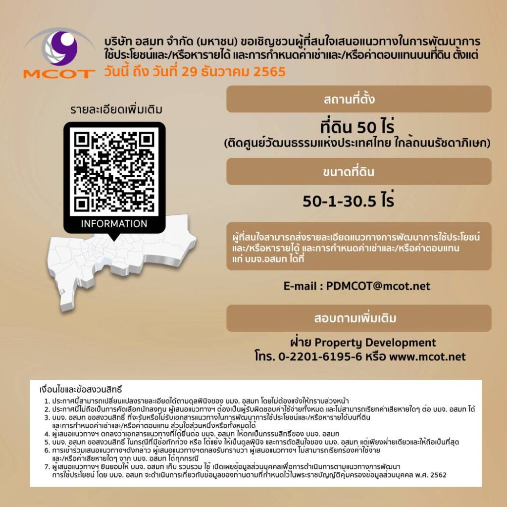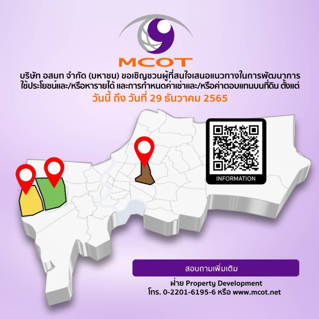 ผู้ที่สนใจสามารถส่งรายละเอียดแนวทางการพัฒนาการใช้ประโยชน์และ/หรือหารายได้ และ การกำหนดค่าเช่าและ/หรือค่าตอบแทน แก่ บมจ.อสมท ได้ที่ E-mail : PDMCOT@mcot.net ได้ตั้งแต่วันนี้ ถึง วันที่ 29 ธันวาคม 2565 สอบถามรายละเอียดเพิ่มเติม โทร. 0-2201-6195-6 หรือ www.mcot.net