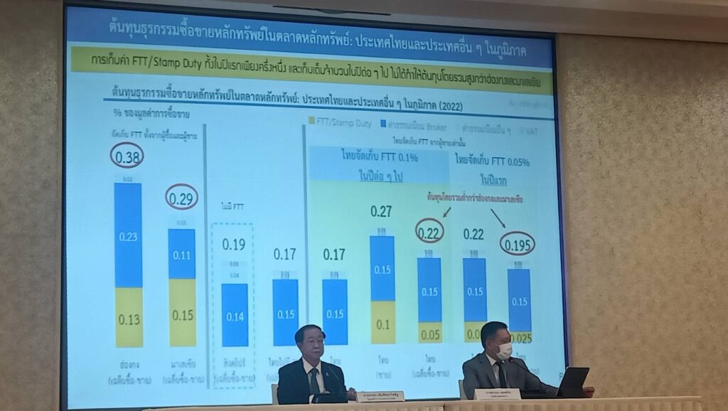 ขณะที่ต้นทุนธุรกรรมการซื้อขายในตลาดหลักทรัพย์ ของไทย (ปี2022)เมื่อเทียบกับประเทศอื่น ในภูมิภาค พบว่าฮ่องกง มีการจัดเก็บภาษีเฉลี่ยทั้งซื้อและขายอยู่ที่ 0.38 % ,มาเลเซีย 0.29 % ,สิงคโปร์ 0.19 % ไทย 0.17 % และการจัดเก็บภาษีใหม่ จะทำให้ต้นทุนธุรกรรมการซื้อขายหลักทรัพย์ของไทยในปีแรกเฉลี่ยอยู่ที่ 0.22 % และ เพิ่มเป็น0.27 % ในปีถัดไป ซึ่งยังต่ำกว่า ฮ่องกงและมาเลเซีย