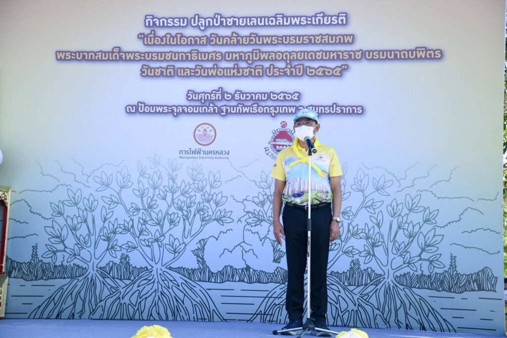 ผู้ว่าการ MEA กล่าวว่า การจัดกิจกรรมปลูกป่าชายเลนและทำพิธีส่งมอบเสาไฟฟ้าส่องสว่าง ณ ป้อมพระจุลจอมเกล้า ฐานทัพเรือกรุงเทพ เป็นการร่วมใจของ MEA และฐานทัพเรือกรุงเทพ ในการดำเนินกิจกรรมเพื่อเฉลิมพระเกียรติ เนื่องในโอกาส วันคล้ายวันพระบรมราชสมภพพระบาทสมเด็จพระบรมชนกาธิเบศร มหาภูมิพลอดุลยเดชมหาราช บรมนาถบพิตร วันชาติ และวันพ่อแห่งชาติ ประจำปี 2565 โดย MEA ร่วมกับฐานทัพเรือกรุงเทพ และหน่วยงาน ชุมชน โรงเรียน บริเวณใกล้เคียง รวมกว่า 600 คน ร่วมกันปลูกกล้าต้นโกงกาง จำนวน 15,000 ต้น ในพื้นที่ป่าชายเลนบริเวณบ้านแหลมสิงห์ ต.แหลมฟ้าผ่า อ.พระสมุทรเจดีย์ จ.สมุทรปราการ (พื้นที่ป้อมพระจุลจอมเกล้า) เพื่อใช้เป็นกำแพงลดความรุนแรงของคลื่นทะเล ช่วยชะลอความเร็วของลมพายุให้ลดลงก่อนที่จะขึ้นสู่ฝั่งไม่ให้เกิดความเสียหายแก่ที่อยู่อาศัยและพื้นที่ทำกินของชาวบ้าน อีกทั้งยังเป็นการสร้างระบบนิเวศชายฝั่ง ซึ่งเป็นที่อยู่อาศัยและที่อนุบาลสำคัญของสัตว์น้ำในระยะตัวอ่อน กิจกรรมครั้งนี้จะช่วยส่งเสริมให้ผู้เข้าร่วมกิจกรรมทุกคนเกิดจิตสำนึกในการอนุรักษ์ป่าชายเลน นำความรู้ที่ได้รับมาขยายผลร่วมกันฟื้นฟูระบบนิเวศป่าชายเลนต่อไป