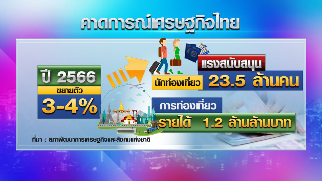 ขณะที่ สภาพัฒนาการเศรษฐกิจและสังคมแห่งชาติ หรือ สภาพัฒน์ เผยแนวโน้มเศรษฐกิจไทยปี ในปี 2566 จะขยายตัวในช่วง 3.0 – 4.0% โดยมีแรงสนับสนุนจากการฟื้นตัวของภาคการท่องเที่ยว โดยปีหน้าไทยจะมีนักท่องเที่ยวเพิ่มเป็น 23.5 ล้านคน มีรายได้จากการท่องเที่ยว 1.2 ล้านล้านบาท แต่ยอมรับว่าในปีหน้า ยังมีความผันผวนเศรษฐกิจโลก โดยเฉพาะจากการระบาดโควิดที่อาจจะกลับมาระบาดขึ้นได้อีก และความกังวลการขยายตัวของสงคราม ระหว่างรัสเซีย-ยูเครน .-สำนักข่าวไทย