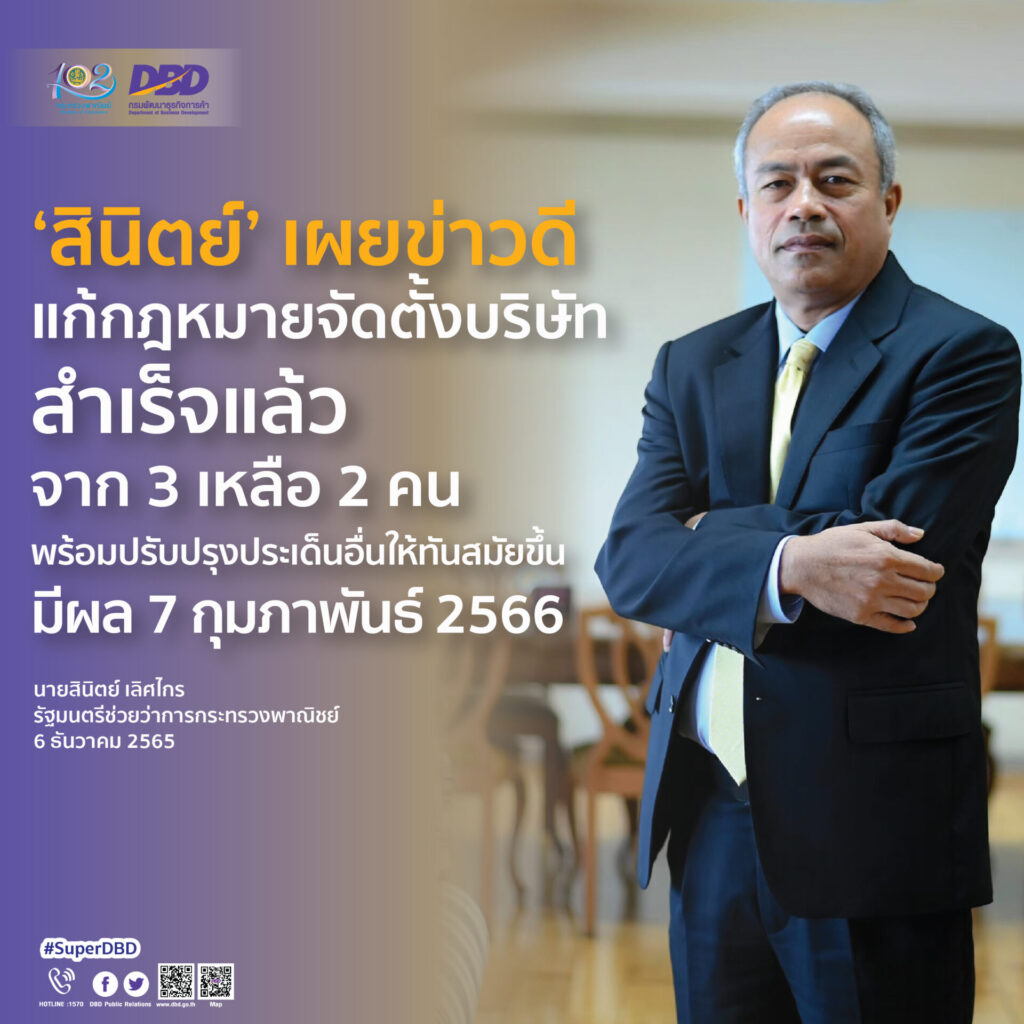 นายสินิตย์ เลิศไกร รัฐมนตรีช่วยว่าการกระทรวงพาณิชย์กล่าวว่าที่ผ่านมากระทรวงพาณิชย์ ได้ผลักดันให้กรมพัฒนาธุรกิจการค้า ในฐานะหน่วยงานที่กำกับดูแลผู้ประกอบธุรกิจในการจดทะเบียนนิติบุคคล เสนอพระราชบัญญัติแก้ไขเพิ่มเติมประมวลกฎหมายแพ่งและพาณิชย์ (ฉบับที่ 23) พ.ศ. 2565 และพระราชบัญญัติกำหนดความผิดเกี่ยวกับห้างหุ้นส่วนจดทะเบียน ห้างหุ้นส่วนจำกัด บริษัทจำกัด สมาคมและมูลนิธิ (ฉบับที่ 5) พ.ศ. 2565 เพื่อปรับปรุงประมวลกฎหมายแพ่งและพาณิชย์ บรรพ 3 ลักษณะ 22 หุ้นส่วนและบริษัทให้มีความทันสมัยรองรับการเปลี่ยนแปลงและพัฒนาการของเทคโนโลยี ส่งเสริมให้จัดตั้งบริษัทจำกัดได้ง่ายขึ้น เพิ่มความคล่องตัวในการประกอบธุรกิจ อีกทั้งช่วยให้บริษัทจำกัดสามารถควบรวมกิจการได้มากกว่าหนึ่งลักษณะ ซึ่งจะเป็นการเสริมสร้างศักยภาพในการแข่งขันของประเทศและสร้างภาพลักษณ์อันดีในการประกอบธุรกิจ รองรับระบบเศรษฐกิจและสังคมดิจิทัล ประการสำคัญที่สุด คือช่วยลดค่าใช้จ่ายและต้นทุนการดำเนินงานให้ผู้ประกอบธุรกิจตามนโยบายของรัฐบาลอีกทางหนึ่ง