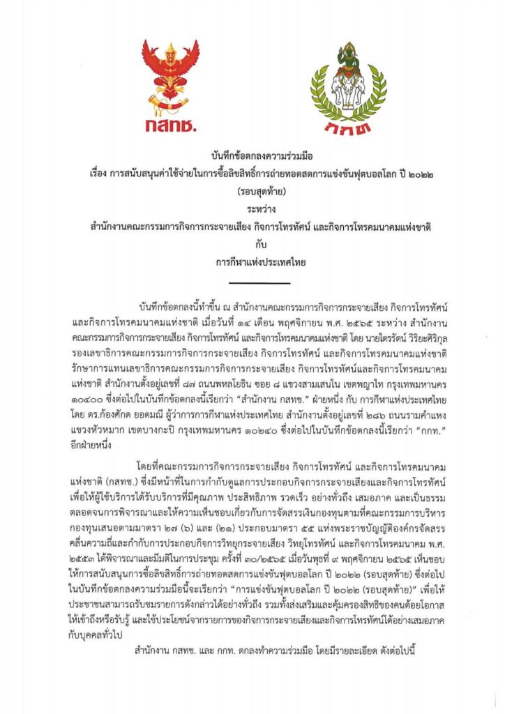 รายงานข่าวจากสำนักงานคณะกรรมการกิจการกระจายเสียง กิจการโทรทัศน์ และกิจการโทรคมนาคม (กสทช.) เปิดเผยว่า ในการประชุมบอร์ด กสทช. นัดพิเศษ วันนี้ (8 ธ.ค.) พิจารณาการดำเนินการตามบันทึกข้อตกลงความร่วมมือเรื่อง การสนับสนุนค่าใช้จ่ายในการถ่ายทอดสดการแข่งขันฟุตบอลโลก ปี 2022 (รอบสุดท้าย) และมีมติเอกฉันท์ให้สำนักงาน กสทช. ส่งหนังสือถึงการกีฬาแห่งประเทศไทย (กกท.) ให้ปฏิบัติตามบันทึกข้อตกลงความร่วมมือระหว่างกัน ที่กำหนดให้ กกท. ต้องบริหารจัดการสิทธิให้ผู้รับอนุญาตให้ประกอบกิจการกระจายเสียงหรือกิจการโทรทัศน์ที่อยู่ในการกำกับดูแลของ กสทช. และสำนักงาน กสทช. สามารถถ่ายทอดสดการแข่งขันฟุตบอลโลก ปี 2022 (รอบสุดท้าย) ได้ตามประกาศ กสทช. เรื่อง หลักเกณฑ์การเผยแพร่กิจการโทรทัศน์ที่ให้บริการเป็นการทั่วไปรวมทั้งต้องดำเนินการให้ผู้ให้บริการโครงข่ายโทรทัศน์ที่ให้บริการโทรทัศน์แบบบอกรับสมาชิกทุกราย ดำเนินการออกอากาศรายการถ่ายทอดสดการแข่งขันฟุตบอลโลก ปี 2022 (รอบสุดท้าย) (FIFA World Cup Final 2022) ให้สมาชิกสามารถได้รับบริการโทรทัศน์ที่เป็นการทั่วไปได้โดยตรงอย่างต่อเนื่อง และไม่มีการเปลี่ยนแปลง ทำซ้ำดัดแปลง ผังรายการหรือเนื้อหารายการ