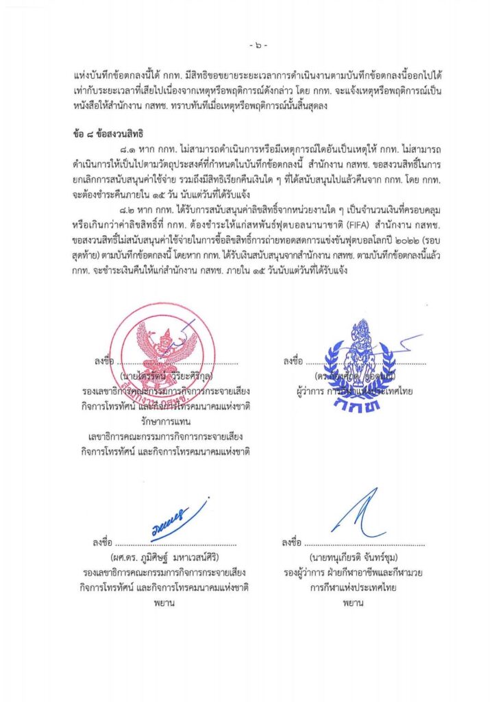 กรณี กกท. ไม่ดำเนินการแก้ไข หรือไม่สามารถปฏิบัติให้ถูกต้องตามที่กำหนด กกท.จะต้องมีหน้าที่ชำระเงินสนับสนุนที่ได้รับไว้ จำนวน 600 ล้านบาท ทั้งหมดคืนแก่สำนักงาน กสทช. ภายใน 15 วัน นับแต่ได้รับแจ้งเป็นหนังสือ พร้อมดอกเบี้ยผิดนัดในอัตราร้อยละ 5 ต่อปี (หากมี) เป็นไป ตามข้อสงวนสิทธิข้อ 8 ใน MOU ก่อนหน้านี้ สำนักงาน กสทช.ได้มีหนังสือลงวันที่ 24 และ 30 พ.ย. ย้ำเตือนให้ กกท.ดำเนินการให้เป็นไปตาม MOU แต่ผ่านไป 1 สัปดาห์ ยังไม่มีการดำเนินการตามนั้น บอร์ด กสทช. จึงมีมติให้สำนักงาน กสทช.แจ้ง กกท.เรื่องการเรียกเงินคืนตาม MOU