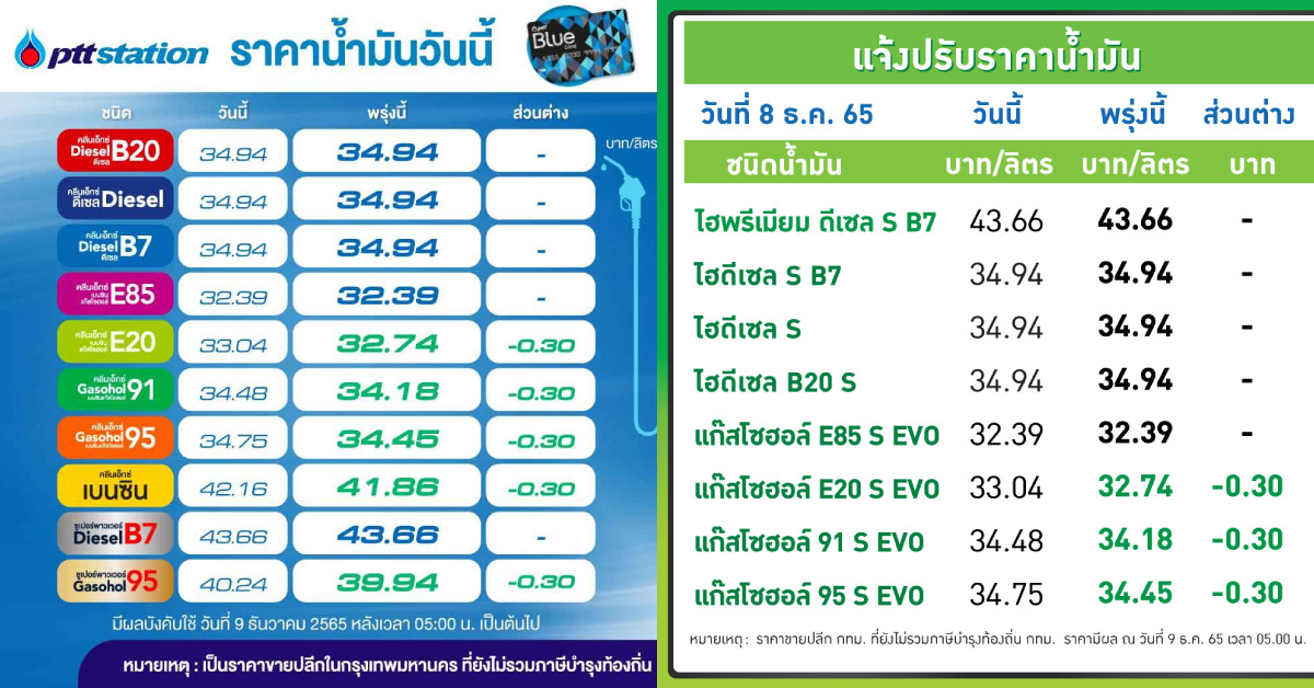 กรุงเทพฯ 8 ธ.ค. – PTT Station-บางจากฯ ปรับราคาขายปลีกน้ำมันกลุ่มเบนซินและแก๊สโซฮอล์ทุกชนิดลง 30 สตางค์/ลิตร เว้น E85 และกลุ่มดีเซลคงเดิม มีผล 9 ธ.ค. 2565 เวลา 05.00 น. เป็นต้นไป