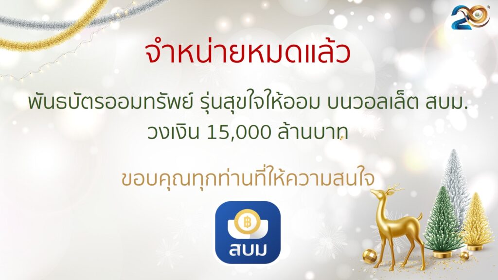 กรุงเทพฯ 9 ธ.ค.-“สุขใจให้ออม” บนวอลเล็ต สบม. ครบวงเงินจำหน่าย 15,000 ล้านบาทแล้ว พบกันอีกครั้ง 13 ธันวาคม 2565 ผ่าน 4 ธนาคารตัวแทนจำหน่าย