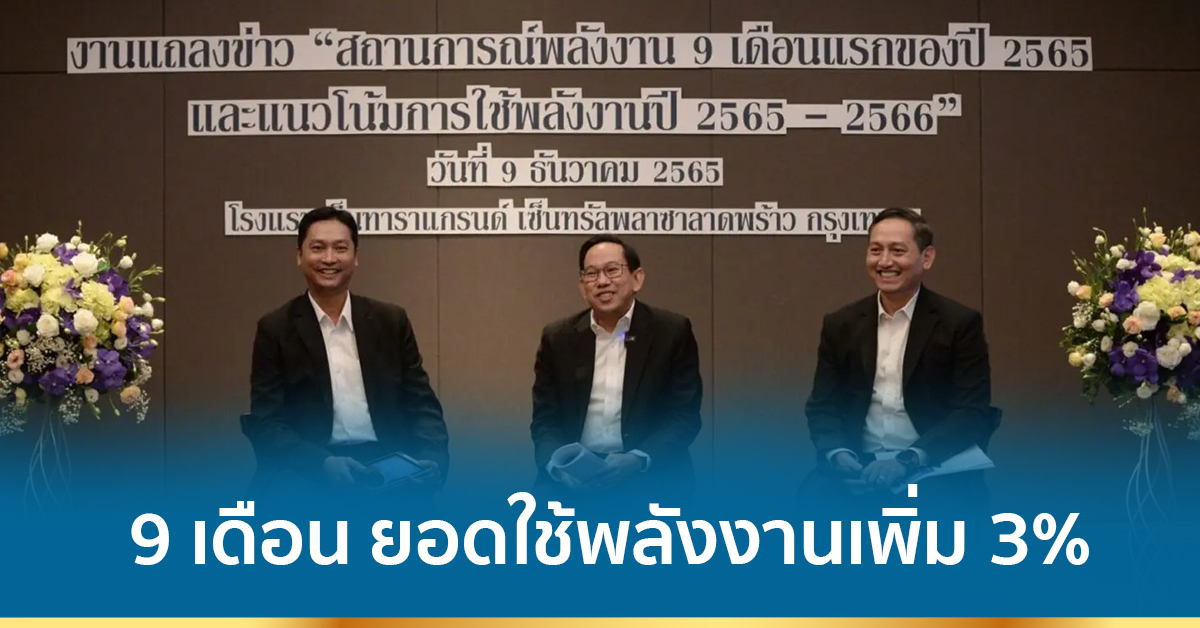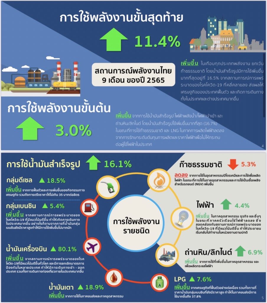 นายวัฒนพงษ์ คุโรวาท ผู้อำนวยการ สำนักงานนโยบายและแผนพลังงานหรือ สนพ. เปิดเผยว่า 9 เดือนแรกของปีนี้พบว่าการใช้พลังงานขั้นต้นเพิ่มขึ้นร้อยละ 3 จากการขยายตัวทางเศรษฐกิจอย่างต่อเนื่อง หลังจากสถานการณ์การแพร่ระบาดของโรคโควิด-19 มีแนวโน้มที่ดีขึ้น รวมถึงมีการผ่อนคลายมาตรการโควิด-19 ที่มากขึ้น ทั้งนี้ในส่วนของการใช้พลังงานขั้นสุดท้ายเพิ่มขึ้นร้อยละ 11.4 ซึ่งเพิ่มสูงขึ้นในเกือบทุกประเภทพลังงาน โดยเฉพาะการใช้น้ำมันสำเร็จรูป ในส่วนของน้ำมันเครื่องบินมีการใช้เพิ่มขึ้นถึงร้อย 80.1 จากการฟื้นตัวของภาคการท่องเที่ยวและบริการสำหรับการใช้ไฟฟ้ามีการใช้เพิ่มขึ้นในเกือบทุกสาขาเศรษฐกิจ โดยเฉพาะสาขาธุรกิจ เพิ่มขึ้นร้อยละ 11.6 จากการขยายตัวของภาคการท่องเที่ยวและบริการ รวมทั้งการที่หน่วยงานภาครัฐและภาคเอกชนให้บุคลากรกลับไปทำงานตามปกติ