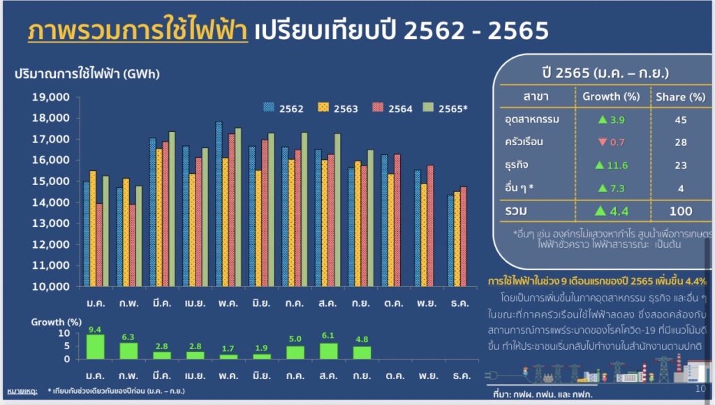 ด้านการใช้ไฟฟ้า เพิ่มขึ้นร้อยละ 4.4 มีการใช้รวมทั้งสิ้น 149,972 กิกะวัตต์ชั่วโมง โดยการใช้ไฟฟ้าส่วนใหญ่ ร้อยละ 45 อยู่ในภาคอุตสาหกรรม ซึ่งมีการใช้เพิ่มขึ้นร้อยละ 3.9 จากเศรษฐกิจที่ขยายตัวมากขึ้นทำให้เกิดการผลิตสินค้าที่เพิ่มขึ้น รองลงมา คือ การใช้ไฟฟ้าในภาคธุรกิจ มีสัดส่วนร้อยละ 23 และมีการใช้ไฟฟ้าเพิ่มขึ้นร้อยละ 11.6 ซึ่งมาจากการที่สถานการณ์การแพร่ระบาดของโรคโควิด-19 มีแนวโน้มดีขึ้น ทั้งนี้ความต้องการพลังไฟฟ้าสูงสุดของระบบ 3การไฟฟ้าของปี 2565 เกิดขึ้นเมื่อวันที่ 28 เมษายน 2565 เวลา 14:30 น. อยู่ที่ระดับ 33,177 เมกกะวัตต์ เพิ่มขึ้นร้อยละ 6.9 เมื่อเทียบกับความต้องการพลังไฟฟ้าสูงสุดในระบบ 3 การไฟฟ้าของปีก่อน