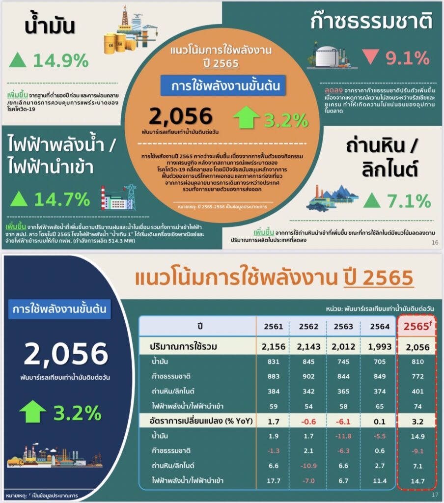 สำหรับแนวโน้มความต้องการใช้พลังงานของประเทศปี 2565 คาดว่าจะความต้องการพลังงานขั้นต้นอยู่ที่ระดับ2,056 พันบาร์เรลเทียบเท่าน้ำมันดิบต่อวัน เพิ่มขึ้นร้อยละ 3.2 เมื่อเทียบกับปี 2564 สอดคล้องกับการขยายตัวทางเศรษฐกิจของประเทศ และกิจกรรมทางเศรษฐกิจที่มีแนวโน้มฟื้นตัว ทั้งนี้คาดการณ์ว่าตลอดทั้งปีนี่ จะมีการใช้พลังงานจะเพิ่มขึ้นเกือบทุกประเภท ยกเว้นก๊าซธรรมชาติที่ได้รับผลกระทบจากการผลิตภายในประเทศที่ลดลง และผลกระทบจากราคาก๊าซธรรมชาติที่ปรับตัวเพิ่มสูงขึ้น เนื่องจากเหตุการณ์ความไม่สงบระหว่างรัสเซียและยูเครน