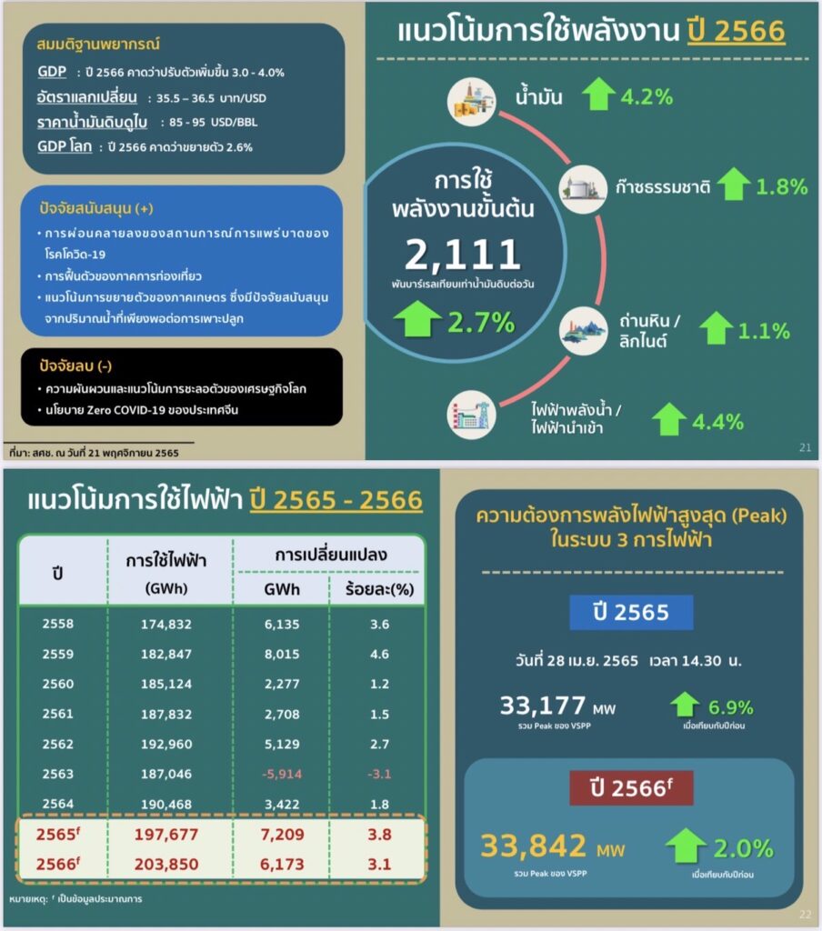 ส่วนแนวโน้มความต้องการใช้พลังงานของประเทศปี 2566 คาดว่าการใช้พลังงานยังเติบโต โดยคาดว่ามีการใช้พลังงานจะเพิ่มขึ้นร้อยละ 2.7 จากความต้องการเดินทางที่มีแนวโน้มกลับมาเป็นปกติมากขึ้นทั้งการเดินทางภายในประเทศและการเดินทางระหว่างประเทศ รวมทั้งการขยายตัวของการลงทุนทั้งการลงทุนภาคเอกชนและภาครัฐ โดยการใช้น้ำมันคาดว่าจะเพิ่มขึ้นร้อยละ 4.2 ก๊าซธรรมชาติคาดว่าจะเพิ่มขึ้นเล็กน้อยอยู่ที่ร้อยละ 1.8 การใช้ถ่านหิน/ลิกไนต์คาดว่าจะเพิ่มขึ้นร้อยละ 1.1 และการใช้ไฟฟ้าพลังน้ำและไฟฟ้านำเข้า คาดว่าจะเพิ่มขึ้นร้อยละ 4.4