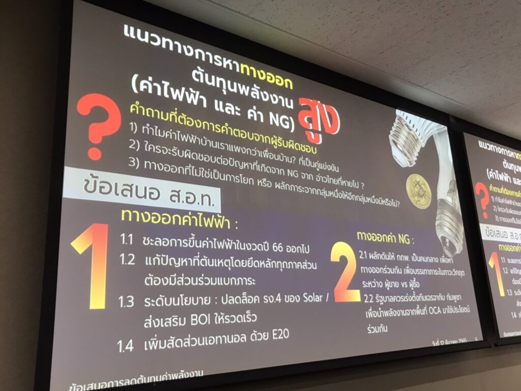 ทั้งนี้ ขอให้ภาครัฐพิจารณาถึงข้อเสนอของ ส.อ.ท. เพื่อหาทางออกต้นทุนพลังงานสูงเป็น 2 ประเด็นหลักๆ คือ ข้อเสนอทางออกค่าไฟฟ้า ขอให้ชะลอการขึ้นค่าไฟฟ้าในงวดเดือนมกราคม – เมษายน 2566 ออกไปก่อน และปลดล็อคกฎระเบียบที่เป็นอุปสรรคในการดำเนินการ เช่น การขอใบอนุญาต รง.4 (กรณีมีการจำหน่ายไฟฟ้าให้ภาครัฐ) การขอใบอนุญาตต่างๆ ที่เกี่ยวข้องกับการติดตั้งโซล่าเซลล์ (Solar Cell) ในโรงงานอุตสาหกรรมและภาคบริการ การส่งเสริมการดำเนินงานร่วมกับ บีโอไอ ให้รวดเร็วและครอบคลุมทุกกลุ่มอุตสาหกรรม และการเพิ่มสัดส่วนเอทานอลด้วยน้ำมันเบนซินไร้สารตะกั่วผสมกับเอทานอล (E20) เป็นต้น และ ข้อเสนอทางออกค่า NG โดยผลักดันให้คณะกรรมการกำกับกิจการพลังงาน (กกพ.) เป็นตัวกลางในการหาทางออกร่วมกัน เพื่อบรรเทาภาระระหว่างผู้ขายกับผู้ซื้อ รวมทั้งรัฐบาลควรเร่งตั้งทีมเจรจากับประเทศกัมพูชา เพื่อนำพลังงานจากพื้นที่ไหล่ทวีปคาบเกี่ยวไทย-กัมพูชา (Overlapping Claimed Area: OCA) มาใช้ประโยชน์ร่วมกัน