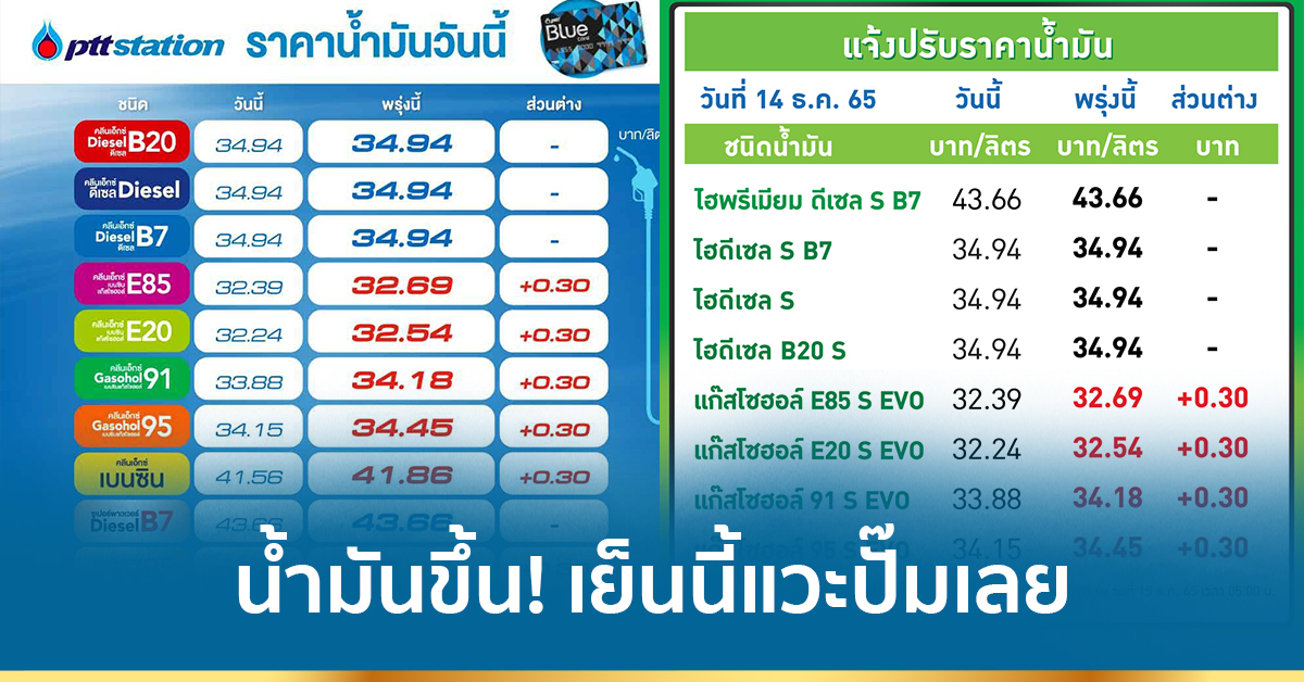 กทม. 14 ธ.ค.- เย็นนี้แวะปั๊มเลย ผู้ค้าแจ้งปรับขึ้นราคาน้ำมันกลุ่มเบนซินและแก๊สโซฮอล์ทุกชนิดขึ้น 30 สตางค์/ลิตร ส่วนกลุ่มดีเซลคงเดิม มีผลพรุ่งนี้ (15 ธ.ค. 2565) เวลา 05.00 น. เป็นต้นไป