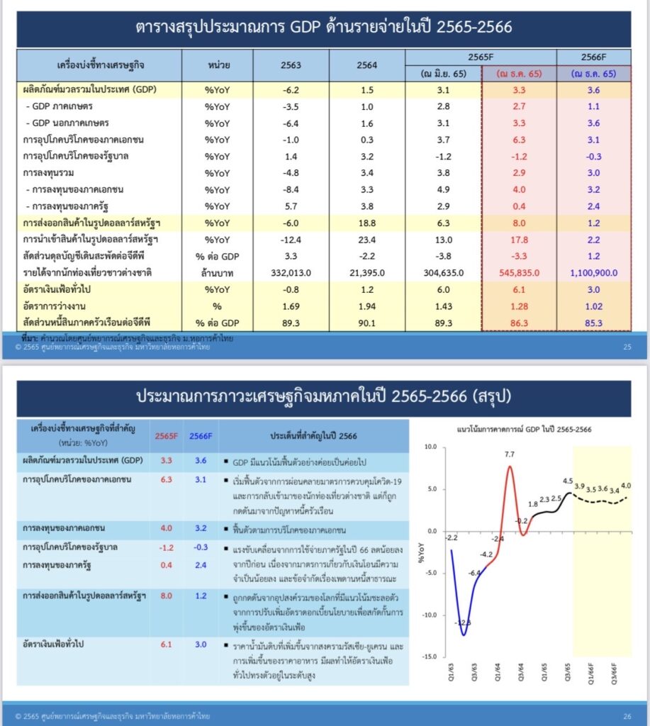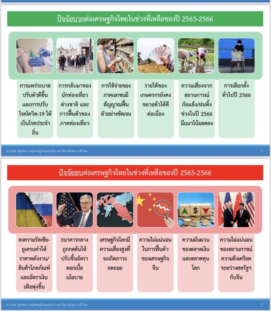 นายธนวรรธน์ พลวิชัย อธิการบดีมหาวิทยาลัยหอการค้าไทย และประธานที่ปรึกษาศูนย์พยากรณ์เศรษฐกิจและธุรกิจเปิดเผย ประมาณการภาวะเศรษฐกิจไทยปี 2565-2566 ว่า ปัจจัยบวกที่มีผลต่อเศรษฐกิจไทยในช่วงที่เหลือของปี2565-2566 คือ การแพร่ระบาดของโควิด19 ปรับตัวดีขึ้นและปรับเป็นโรคประจำถิ่น การกลับมาขอให้นักท่องเที่ยวต่างชาติและการฟื้นตัวของภาคการท่องเที่ยว การใช้จ่ายของภาคเอกชนมีสัญญาณการฟื้นตัวอย่างชัดเจน รายได้ของเกษตรกรยังคงขยายตัวได้ดีต่อเนื่อง และการเลือกตั้งทั่วไปในปี 2566