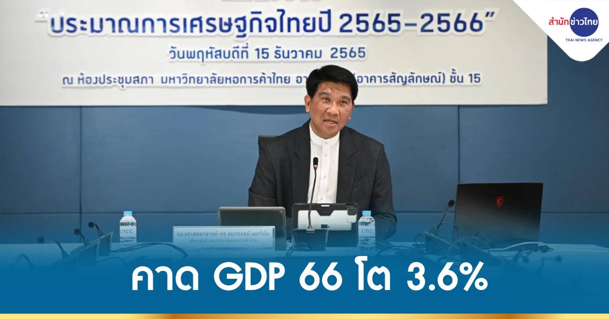 กรุงเทพฯ 15 ธ.ค.-ศูนย์พยากรณ์เศรษฐกิจและธุรกิจ มหาวิทยาลัยหอการค้าไทย ประเมินภาพรวมเศรษฐกิจไทยปีหน้า โดยจีดีพี 66โต 3.6% ส่งออกโตแค่ 1.2% อัตราเงินเฟ้อ 3% มีปัจจัยเสริมจากรายได้ท่องเที่ยว เลือกตั้ง หนุนเศรษฐกิจไทยฟื้นปีหน้าได้