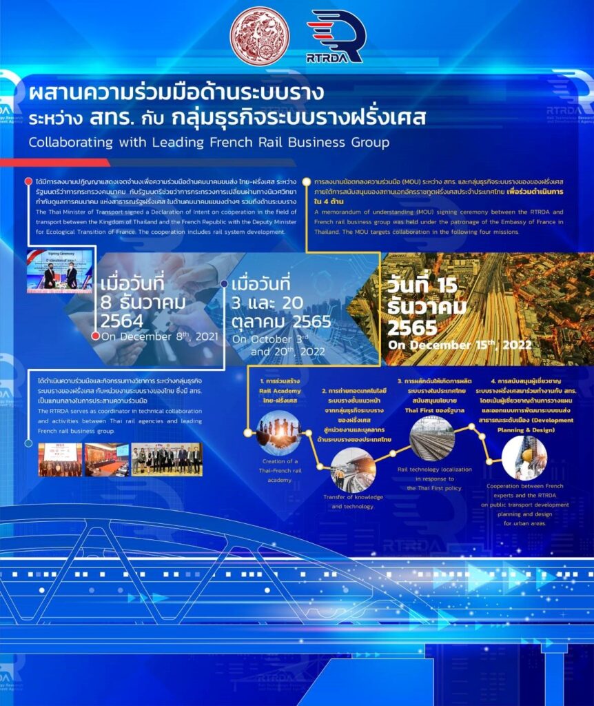 3) การวิจัยและพัฒนาร่วมกันและถ่ายทอดเทคโนโลยีและนวัตกรรมระบบรางขั้นแนวหน้าระหว่างกลุ่มธุรกิจระบบรางชั้นนำของฝรั่งเศสและเครือข่ายการวิจัยและพัฒนาของประเทศไทย เพื่อส่งเสริมให้ประเทศไทยเป็นศูนย์กลางการสร้างเทคโนโลยีและนวัตกรรมของภูมิภาค ซึ่ง กระทรวงคมนาคม เชื่อมั่นว่าความร่วมมือนี้จะเปิดโอกาสให้ได้แบ่งปันความรู้และเทคโนโลยีที่สามารถสร้างนวัตกรรม ขีดความสามารถ โอกาสทางธุรกิจ และความร่วมมือ ที่เป็นคุณประโยชน์ให้กับประเทศไทยและฝรั่งเศส รวมไปถึงการร่วมพัฒนาระบบขนส่งทางรางในระดับอาเซียน ภูมิภาค และนานาชาติไปด้วยกัน