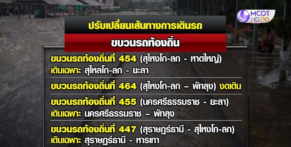 กรุงเทพฯ 18 ธ.ค. – การรถไฟแห่งประเทศไทย แจ้งปรับเปลี่ยนเส้นทางเดินรถสายใต้ ที่มีต้นทางปลายทางที่สถานีหาดใหญ่ ยะลา และสุไหงโก-ลก ระหว่างวันที่ 18-19 ธ.ค.นี้ เนื่องจากสถานการณ์น้ำท่วม
