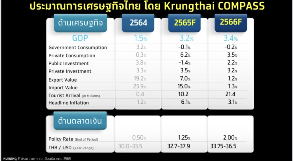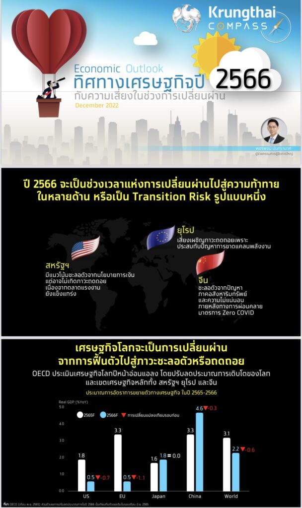 “Krungthai COMPASS มองว่าปีหน้าจะเป็นช่วงเวลาแห่งการเปลี่ยนผ่านไปสู่ความท้าทายในหลายด้าน ซึ่งล้วนเป็นโจทย์ใหม่ที่ยังไม่ทราบคำตอบที่แน่ชัด จึงมีความเสี่ยงใหม่ที่เกิดขึ้นในช่วงการเปลี่ยนผ่าน หรือเป็น Transition Risk รูปแบบหนึ่ง โดยเศรษฐกิจโลกจะเป็นการเปลี่ยนผ่านจากการฟื้นตัวไปสู่ภาวะชะลอตัวหรือถดถอยแบบไร้ตัวช่วยทั้งนโยบายการเงินและนโยบายการคลัง กรณีสหรัฐฯ มีแนวโน้มชะลอตัวแต่อาจไม่เกิดภาวะถดถอยเนื่องจากตลาดแรงงานยังแข็งแกร่ง ขณะที่ยุโรปเสี่ยงเผชิญภาวะถดถอยเพราะประสบกับปัญหาการขาดแคลนพลังงาน ส่วนจีนชะลอตัวจากปัญหาภาคอสังหาริมทรัพย์และความไม่แน่นอนภายหลังทางการผ่อนคลายมาตรการ Zero COVID เงื่อนไขเหล่านี้จะทำให้การดำเนินนโยบายเศรษฐกิจของประเทศหลักในปีหน้ามีความซับซ้อนและหาสมดุลได้ยาก”
