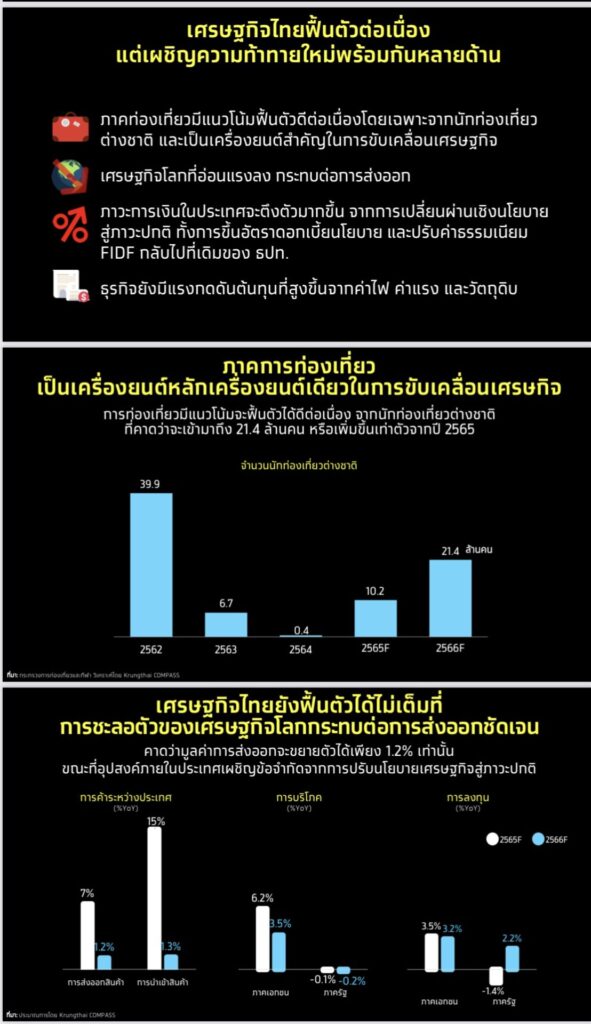 ทั้งนี้ ได้ประเมินเศรษฐกิจไทยในปี 2566 จะขยายตัวที่ 3.4% สูงกว่าปี 2565 ที่คาดว่าจะขยายตัว 3.2% แต่ก็ต่ำกว่าที่คาดไว้ก่อนหน้านี้จากแรงกดดันของเศรษฐกิจโลกที่อ่อนแรงลง กระทบต่อภาคการส่งออกซึ่งคาดว่ามูลค่าการส่งออกจะขยายตัวได้เพียง 1.2% เท่านั้น และภาวะการเงินในประเทศที่จะตึงตัวมากขึ้นจากการที่ธนาคารแห่งประเทศไทยส่งสัญญาณถึงความต้องการให้อัตราดอกเบี้ยในตลาดปรับตัวสูงขึ้นเพื่อจัดการกับเงินเฟ้อที่จะยังสูงกว่ากรอบเป้าหมายที่ 3% ในด้านการท่องเที่ยวมีแนวโน้มจะฟื้นตัวได้ดีต่อเนื่องจากนักท่องเที่ยวต่างชาติที่คาดว่าจะเข้ามาถึง 21.4 ล้านคนหรือเพิ่มขึ้นเท่าตัวจากปี 2565 สนับสนุนดุลบัญชีเดินสะพัดของให้กลับมาเกินดุล ส่วนค่าเงินบาทยังเผชิญความผันผวนจากการคาดการณ์นโยบายการเงินของสหรัฐฯ โดยประเมินว่าค่าเงินบาทจะอยู่ในช่วง 33.75 – 36.50 บาทต่อดอลลาร์สหรัฐฯ