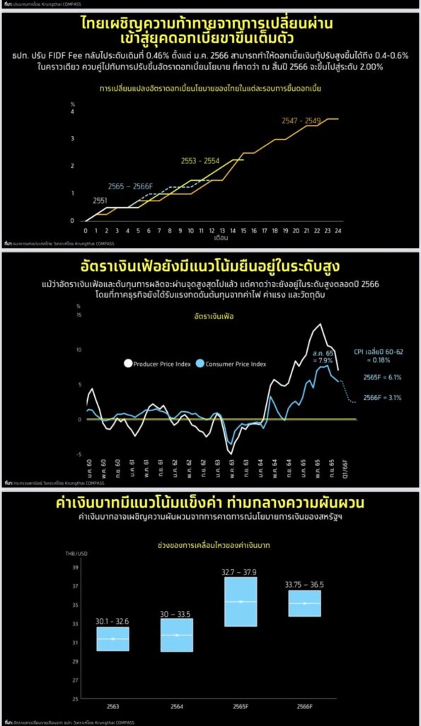นอกจากนี้ เศรษฐกิจไทยปี 2566 จะถูกขับเคลื่อนจากภาคการท่องเที่ยว ขณะเดียวกันก็ต้องเผชิญความท้าทายใหม่จากนโยบายสู่ภาวะปกติ โดยเฉพาะมาตรการทางการเงิน ที่ธนาคารแห่งประเทศไทยจะปรับค่าธรรมเนียม FIDF กลับไปที่เดิมที่ 0.46% ตั้งแต่เดือนมกราคม 2566 โดยอัตราดอกเบี้ยเงินกู้ปรับสูงขึ้นได้ถึง 0.4-0.6% และสิ้นปี 2566 จะขึ้นไปสู่ระดับ 2.00% จึงเป็นยุคดอกเบี้ยขาขึ้นเต็มตัว ดังนั้น การบริหารความเสี่ยงที่เป็นผลจากการเปลี่ยนผ่านซึ่งครอบคลุมในหลายมิติ คือ การเปลี่ยนผ่านสู่สังคมคาร์บอนต่ำ การเปลี่ยนผ่านสู่ยุคดิจิทัลเทคโนโลยี การเปลี่ยนผ่านสู่ตลาดแรงงานที่ต้องมีการ Up & Re-skill และการเปลี่ยนผ่านสู่ความยั่งยืนในทุกมิติของการดำเนินธุรกิจเป็นต้น.-สำนักข่าวไทย