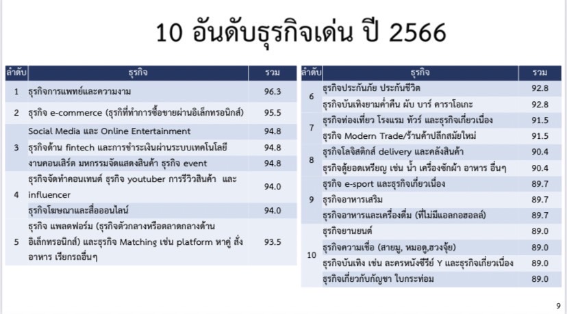 อันดับ 10 ธุรกิจยานยนด์, ธุรกิจความเชื่อ (สายมู, หมอดู,ฮวงจุ้ย), ธุรกิจบันเทิง เช่น ละครหนังซีรีย์ Y และธุรกิจเกี่ยวเนื่อง, ธุรกิจเกี่ยวกับกัญชา ใบกระท่อม ได้ 89.0 คะแนน