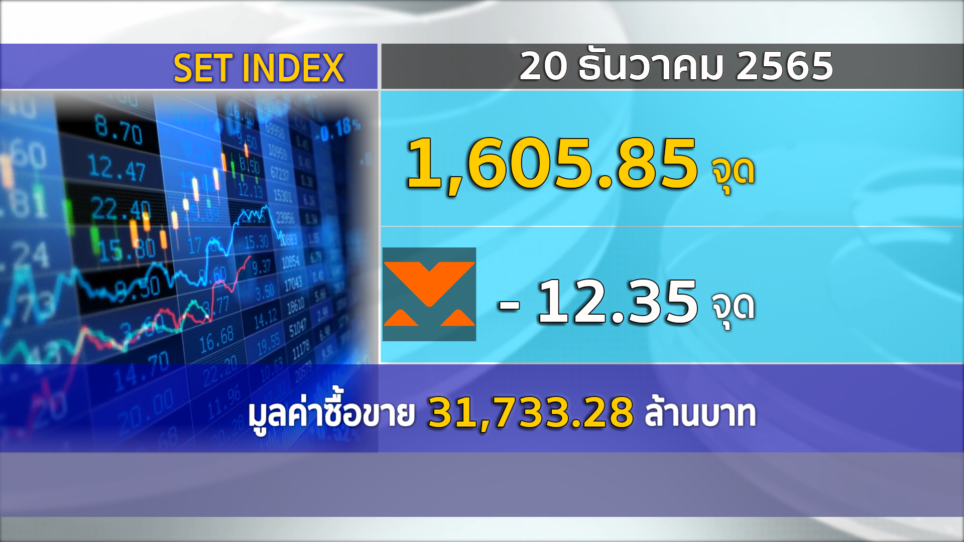 กทม. 20 ธ.ค.- ตลาดหลักทรัพย์ ปิดช่วงเช้าวันนี้ที่ 1,605.85 จุด ลดลง 12.35 จุด (-0.76%) มูลค่าการซื้อขายราว 31,733.28 ล้านบาท