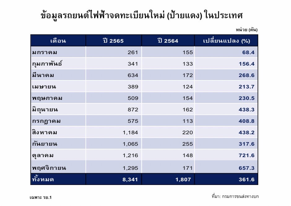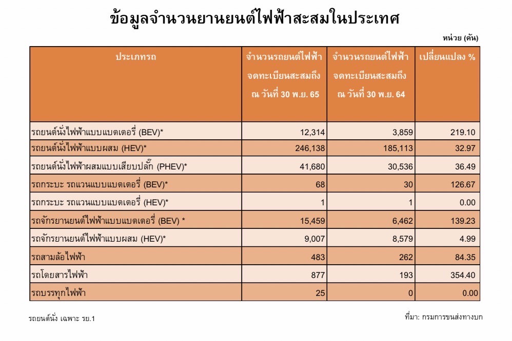 โดยสิ้นเดือน พ.ย. 65 ยานยนต์ไฟฟ้าจดทะเบียนสะสมประเภท BEV จำนวนทั้งสิ้น 29,402คัน เพิ่มขึ้นจากปีที่แล้วร้อยละ 169.40 ส่วนประเภท HEV มีจำนวนทั้งสิ้น 255,773 คัน เพิ่มขึ้นจากปีที่แล้วร้อยละ 31.59 และประเภทPHEV มีจำนวนทั้งสิ้น 41,743 คัน เพิ่มขึ้นจากปีที่แล้วร้อยละ 36.43