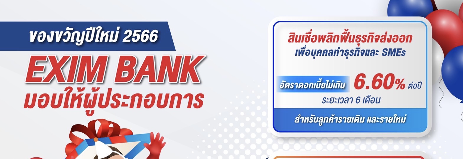 กล่องของขวัญที่ 1 สินเชื่อพลิกฟื้นธุรกิจส่งออก เพื่อบุคคลทำธุรกิจ และ SMEs EXIM BANK ให้ “อัตราดอกเบี้ย” ร้อยละ 4.34 ต่อปีถึงไม่เกินร้อยละ 6.60 ต่อปี ระยะเวลา 6 เดือน สำหรับลูกค้ารายเดิมและรายใหม่ ด้วย 3 ผลิตภัณฑ์ที่ช่วยให้คนตัวเล็กกล้ามีความกล้าและความพร้อมที่จะเริ่มต้นธุรกิจ คือ