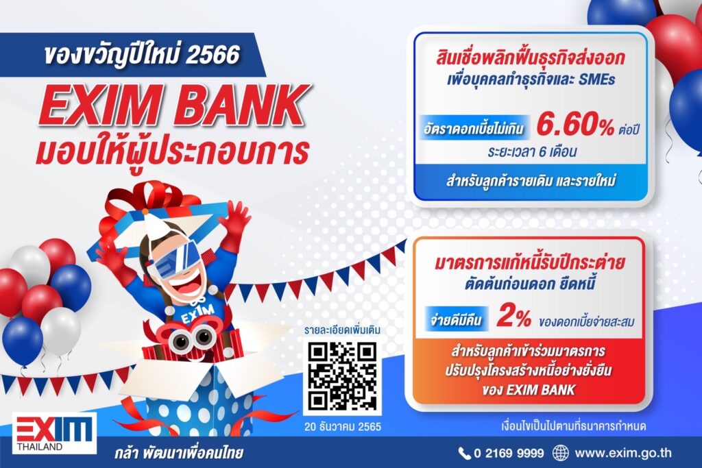 “EXIM BANK ขอส่งความสุขให้แก่ภาคธุรกิจ ด้วยแพ็กเกจของขวัญปีใหม่ ประกอบด้วยสินเชื่อพลิกฟื้นธุรกิจส่งออกอัตราดอกเบี้ยพิเศษ และพิเศษในปีนี้ ธนาคารมีสินเชื่อให้แก่บุคคลธรรมดาที่ทำธุรกิจให้พร้อมเริ่มต้นส่งออกได้ และมาตรการแก้หนี้ ตัดต้นก่อนดอก ยืดหนี้ พร้อมคืนเงินร้อยละ 2 หากชำระเป็นปกติ เพื่อให้ภาคธุรกิจมีขวัญกำลังใจและสภาพคล่อง รับโอกาสใหม่ ๆ ทางธุรกิจในปีหน้าได้” ดร.รักษ์ กล่าว .-สำนักข่าวไทย