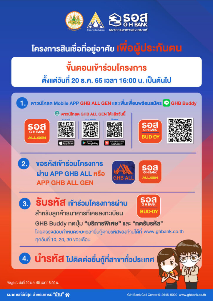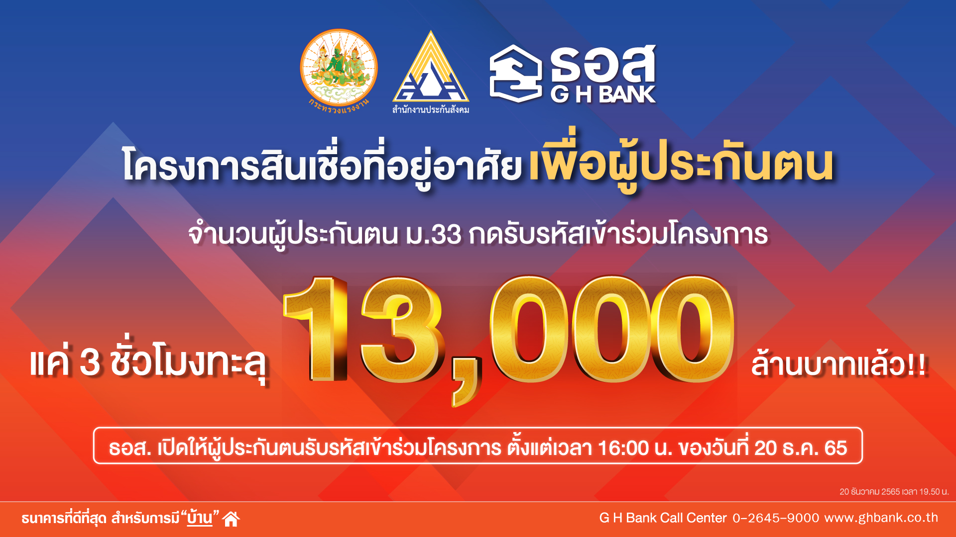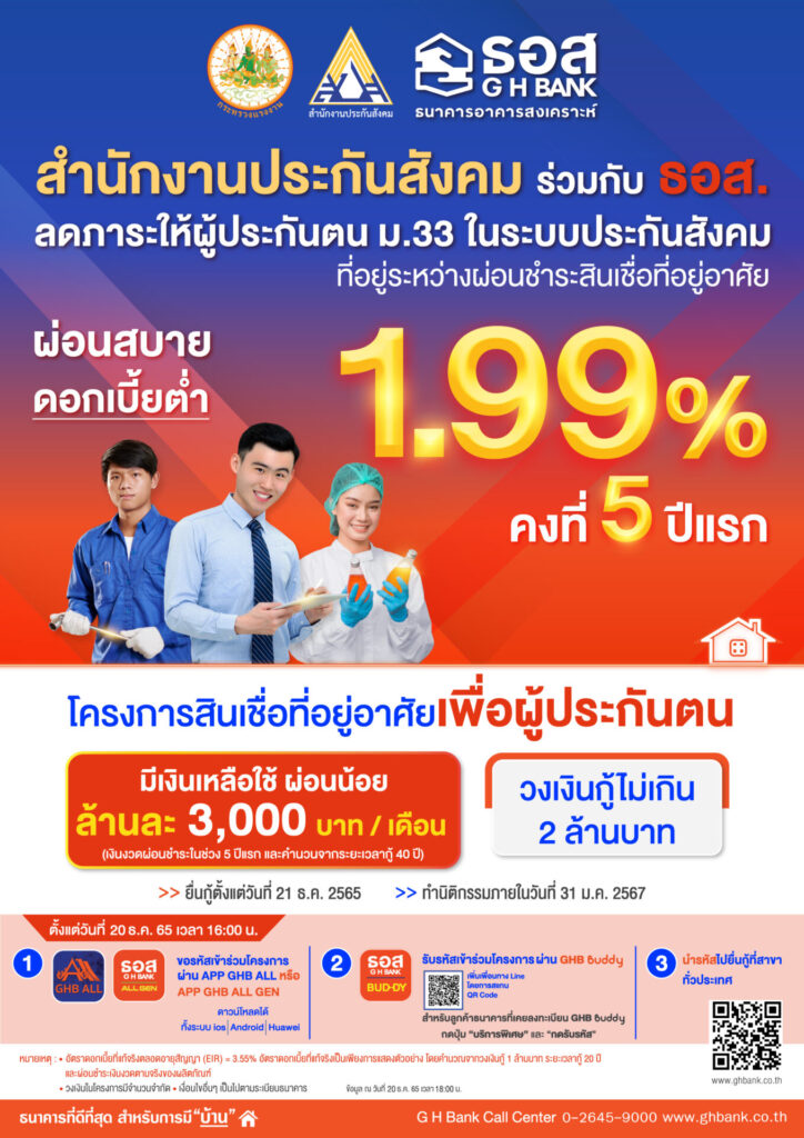 นายฉัตรชัย ศิริไล กรรมการผู้จัดการ ธนาคารอาคารสงเคราะห์ (ธอส.) เปิดเผยว่า ตามที่สำนักงานประกันสังคม กับธนาคารอาคารสงเคราะห์ ร่วมกันจัดทำ “โครงการสินเชื่อที่อยู่อาศัย เพื่อผู้ประกันตน” ภายใต้กรอบวงเงินสินเชื่อรวม 30,000 ล้านบาท เพื่อสนับสนุนนโยบายรัฐบาล ลดภาระค่าใช้จ่ายในการผ่อนชำระเงินงวดที่อยู่อาศัยให้กับผู้ประกันตนในระบบประกันสังคม มาตรา 33 ที่จ่ายเงินสมทบมาแล้วไม่น้อยกว่า 6 เดือน สามารถใช้สิทธิในการไถ่ถอนจำนองที่ดินพร้อมอาคาร หรือห้องชุด จากสถาบันการเงินอื่น รวมถึงเพื่อลดอัตราดอกเบี้ยสินเชื่อที่อยู่อาศัยในบัญชีเงินกู้ที่กู้อยู่กับ ธอส. วงเงินให้กู้สูงสุดตามจำนวนเงินต้นคงเหลือไม่เกิน 2 ล้านบาท/หลักประกัน อัตราดอกเบี้ยคงที่ ปีที่ 1-5 ปี เท่ากับ 1.99% ต่อปี โดยเปิดให้ขอรับรหัสผ่าน Application : GHB ALL หรือ GHB ALL GEN ได้ตั้งแต่วันที่ 20 ธันวาคม 2565 เวลา 16.00 น. เป็นต้นไป เพื่อรับรหัสผ่าน GHB Buddy ใน Line Application นั้น ล่าสุด ณ เวลา 19.00 น. ของวันที่ 20 ธันวาคม 2565 หรือเพียง 3 ชั่วโมง หลังจากเริ่มเปิดให้รับรหัส พบว่ามีจำนวนผู้ประกันตนกดรับรหัสแล้วว่า 6,530 ราย คิดเป็นวงเงินสินเชื่อรวมสูงถึงกว่า 13,000 ล้านบาท