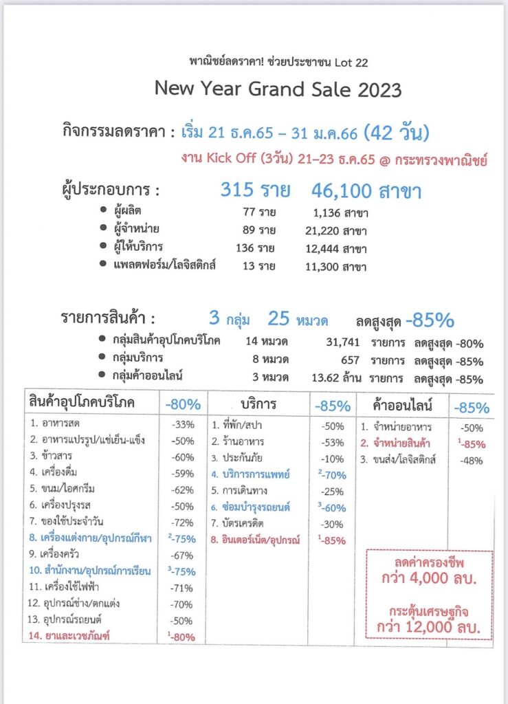 นนทบุรี 21 ธ.ค.-รัฐมนตรีพาณิชย์เปิดโครงการ “พาณิชย์ลดราคา!ช่วยประชาชน Lot22 (New Year Grand Sale 2023) แจกของขวัญปีใหม่ ลดกระหน่ำสินค้า-บริการ-ออนไลน์ สูงสุด 85% กว่า 46,100 สาขาทั่วประเทศ วันนี้-31 ม.ค.66 คาดกระตุ้นเศรษฐกิจร่วม 12,000 ล้านบาท