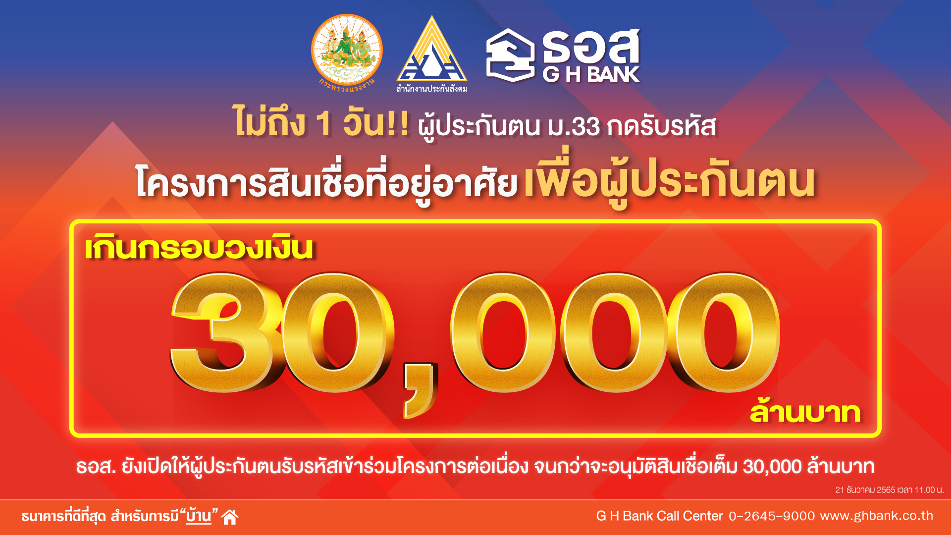 นายฉัตรชัย ศิริไล กรรมการผู้จัดการ ธนาคารอาคารสงเคราะห์ (ธอส.) เปิดเผยว่า หลังจากที่ ธอส. และ สำนักงานประกันสังคม(สปส.) เปิดให้ผู้ประกันตนในระบบประกันสังคม มาตรา 33 ที่จ่ายเงินสมทบมาแล้วไม่น้อยกว่า 6 เดือนสามารถใช้สิทธิในการไถ่ถอนจำนองที่ดินพร้อมอาคาร หรือห้องชุดจากสถาบันการเงินอื่น รวมถึงเพื่อลดอัตราดอกเบี้ยสินเชื่อที่อยู่อาศัยในบัญชีเงินกู้ที่กู้อยู่กับ ธอส. ใน โครงการสินเชื่อที่อยู่อาศัยเพื่อผู้ประกันตน วงเงินให้กู้สูงสุดตามจำนวนเงินต้นคงเหลือไม่เกิน 2 ล้านบาท/หลักประกัน อัตราดอกเบี้ยคงที่ ปีที่ 1-5 ปี เท่ากับ 1.99% ต่อปี โดยขอรับรหัสเข้าร่วมโครงการผ่าน Application : GHB ALL หรือ GHB ALL GEN ได้ตั้งแต่วันที่ 20 ธันวาคม 2565 เวลา 16.00 น. เป็นต้นไป เพื่อรับรหัสผ่าน GHB Buddy ใน Line Application นั้นล่าสุด ณ เวลา 11.30 น. ของวันที่ 21 ธันวาคม 2565 หรือภายในระยะเวลาไม่ถึง 24 ชั่วโมง หลังเริ่มเปิดให้รับรหัสปรากฏว่ามีจำนวนผู้ประกันตนกดรับรหัสแล้วกว่า 15,000 ราย คิดเป็นวงเงินสินเชื่อเกินกว่ากรอบวงเงินโครงการ30,000 ล้านบาทเรียบร้อยแล้ว สะท้อนถึงความสำเร็จของการดำเนิน