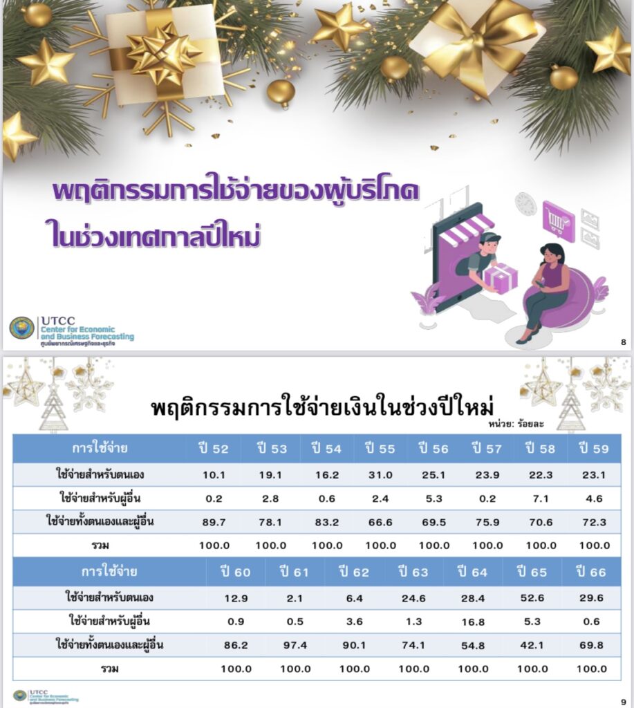 นายธนวรรธน์ พลวิชัย อธิการบดีมหาวิทยาลัยหอการค้าไทย และประธานที่ปรึกษาศูนย์พยากรณ์เศรษฐกิจและธุรกิจ เปิดเผยถึงผลสำรวจพฤติกรรมการใช้จ่ายของผู้บริโภคในช่วงเทศกาลปีใหม่ พบว่า กลุ่มตัวอย่าง 1,345 ตัวอย่างทั่วประเทศ ส่วนใหญ่ร้อยละ 55.9 มีการวางแผนออกนอกพื้นที่ในช่วงเทศกาลปีใหม่ ซึ่งส่วนใหญ่เป็นการวางแผนท่องเที่ยวและเดินทางกลับบ้าน ซึ่งจะมีมูลค่าการใช้จ่ายเพิ่มขึ้น จากการวางแผนเดินทางช่วงระหว่างวันที่ 29 ธันวาคม 2565 ถึงวันที่ 2 มกราคม 2566 โดยมียอดการใช้จ่ายเพิ่มขึ้นเฉลี่ยเป็นคนละ 10,262 บาท
