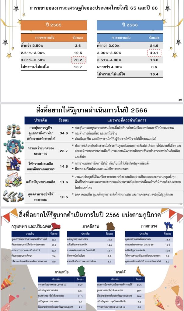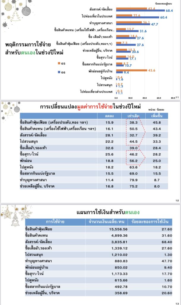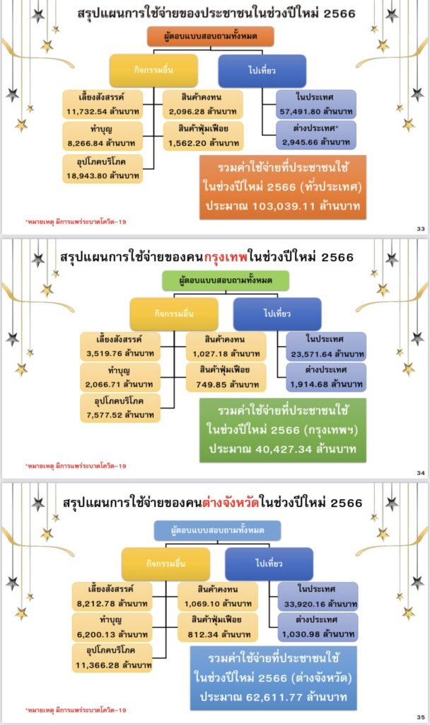 ส่งผลกับเม็ดเงินท่องเที่ยวในประเทศ 57,491 ล้านบาท ท่องเที่ยวต่างประเทศกว่า 2,945 ล้านบาท การวางแผนจัดกิจกรรมเลี้ยงสังสรรค์ มูลค่า 11,732 ล้านบาท ทำบุญ มูลค่า 8,266 ล้านบาท ซื้อสินค้าอุปโภคบริโภค มูลค่า 18,943 ล้านบาท ซื้อสินค้าคงทน 2,000 ล้านบาท และซื้อสินค้าฟุ่มเฟือยอีกกว่า 1,500 ล้านบาท ส่งผลทำให้เงินสะพัดในช่วงเทศกาลปีใหม่ 2566 ขยายตัวเพิ่มขึ้นร้อยละ 20.1 เป็นการขยายตัวสูงสุดในรอบ 17 ปี และคิดเป็นมูลค่าเงินสะพัดกว่า 103,039 ล้านบาท ซึ่งเป็นเม็ดเงินที่สูงสุดในรอบ 3 ปี แตะระดับ 100,000 ล้านบาทแล้ว เป็นการสะท้อนให้เห็นว่าความกังวลต่อสถานการณ์โควิด-19 ได้จบลงแล้ว
