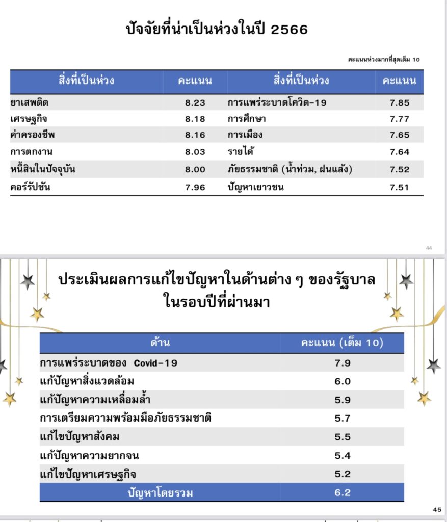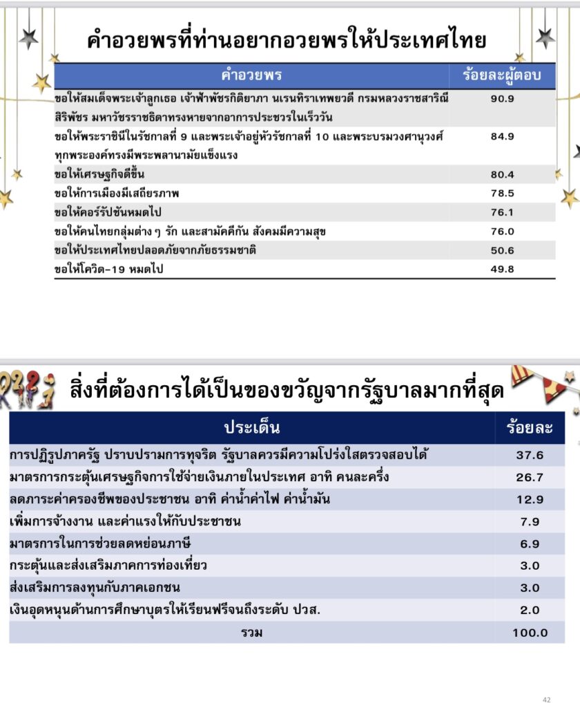 ทั้งนี้ ส่วนใหญ่มองว่า บรรยากาศของช่วงเทศกาลปีใหม่ปีนี้จะคึกคักมากกว่าในปีที่ผ่านมา และคำอวยพรของประชาชนในปีนี้ คือ ขอให้สมเด็จพระเจ้าลูกเธอ เจ้าฟ้าพัชรกิติยาภา นเรนทิราเทพยวดี กรมหลวงราชสาริณีสิริพัชร มหาวัชรราชธิดา ทรงหายจากพระอาการประชวรในเร็ววัน ขอให้สมเด็จพระนางเจ้าสิริกิติ์ พระบรมราชินีนาถ พระบรมราชชนนีพันปีหลวง พระเจ้าอยู่หัวรัชกาลที่ 10 และพระบรมวงศานุวงศ์ทุกพระองค์ ทรงมีพระพลานามัยแข็งแรง ขอให้เศรษฐกิจดีขึ้น การเมืองมีเสถียรภาพ และคอร์รัปชันหมดไป